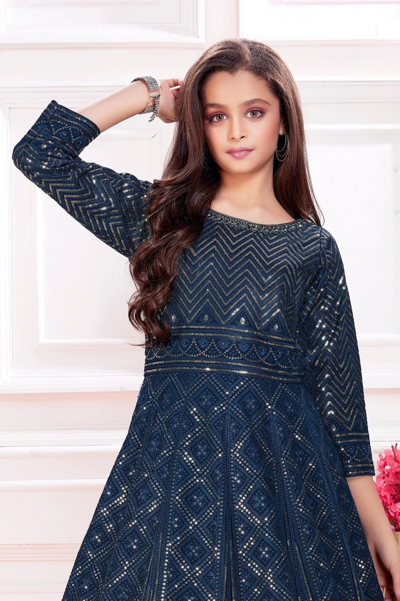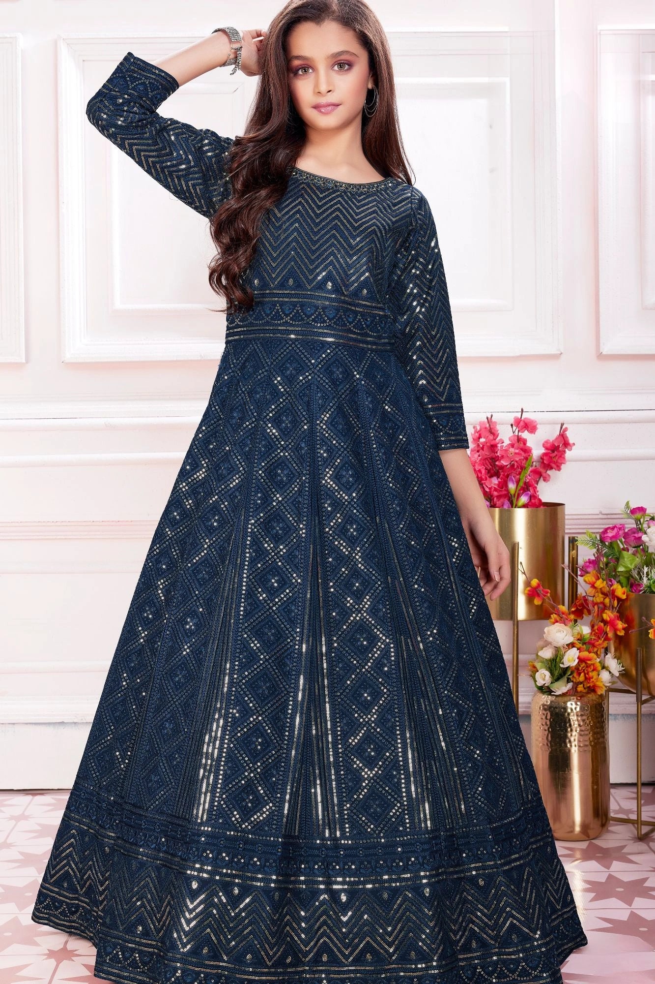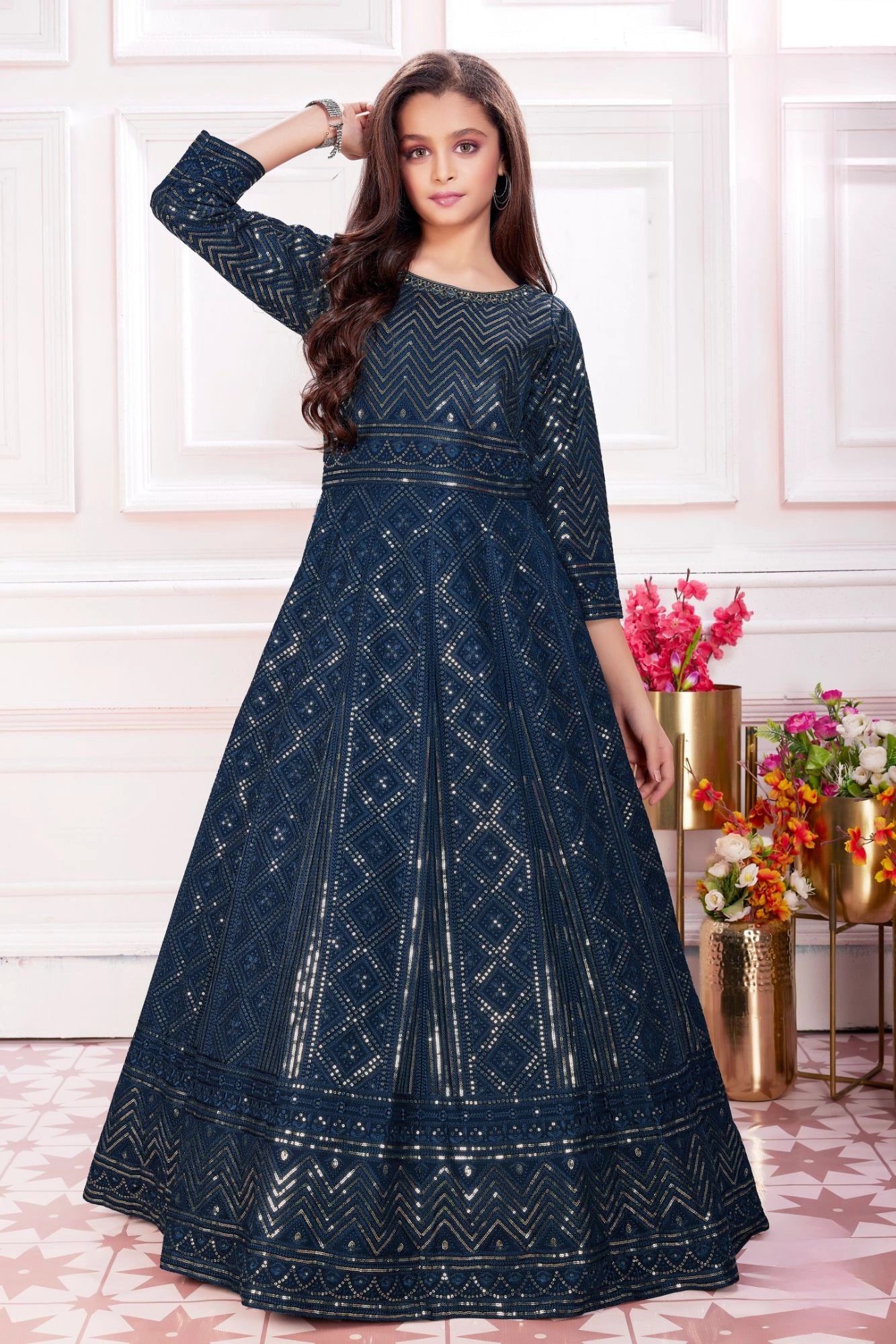 Navy Blue Sequined Long Ethnic Gown For Girls
