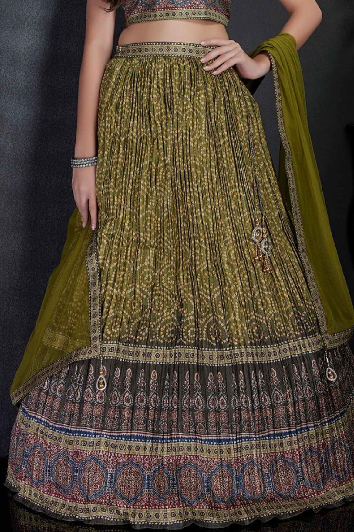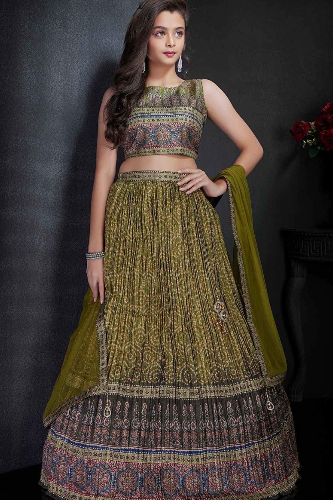 Olive Green Bandhani Printed Lehenga Choli with Dupatta for Girls