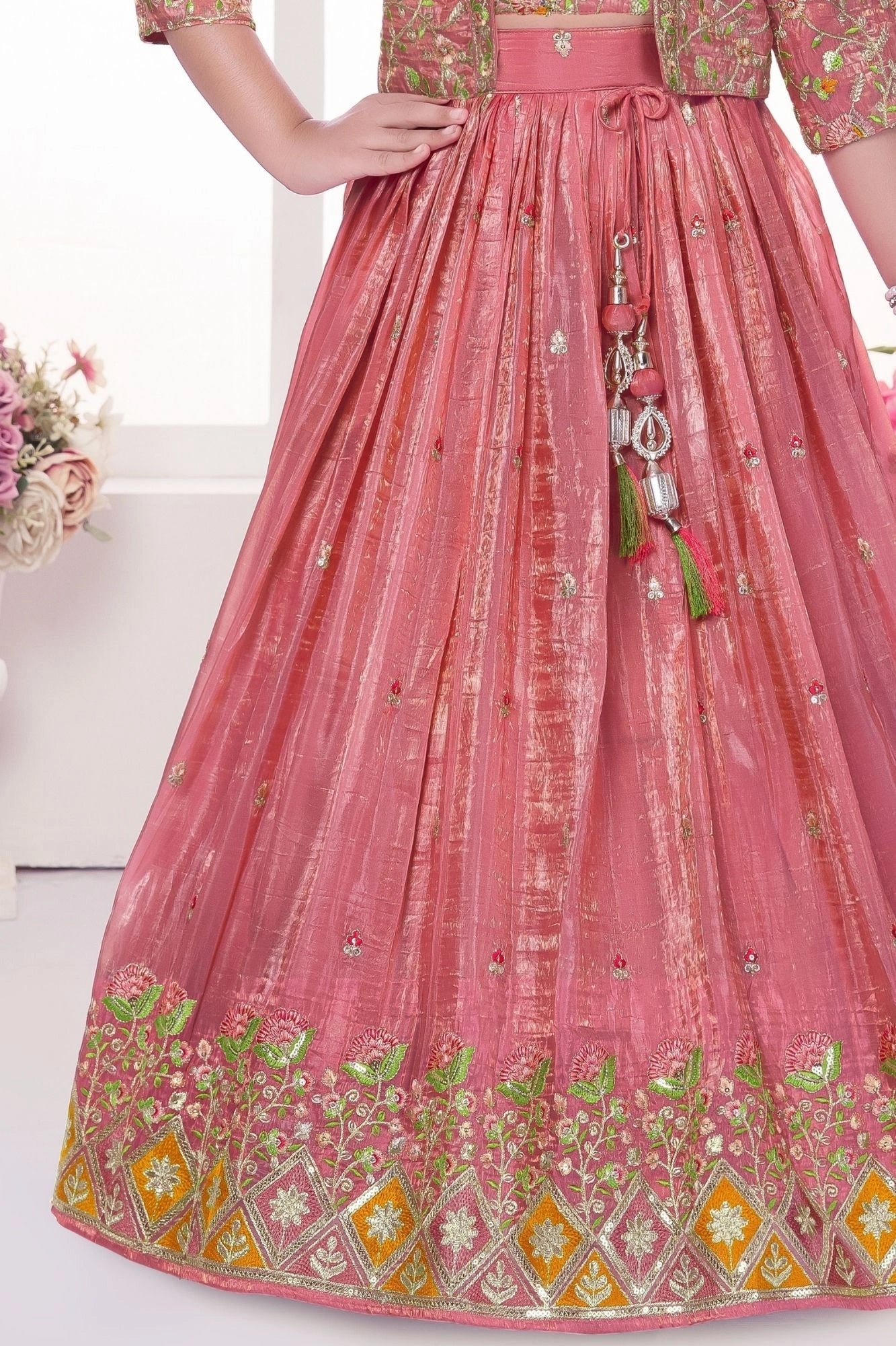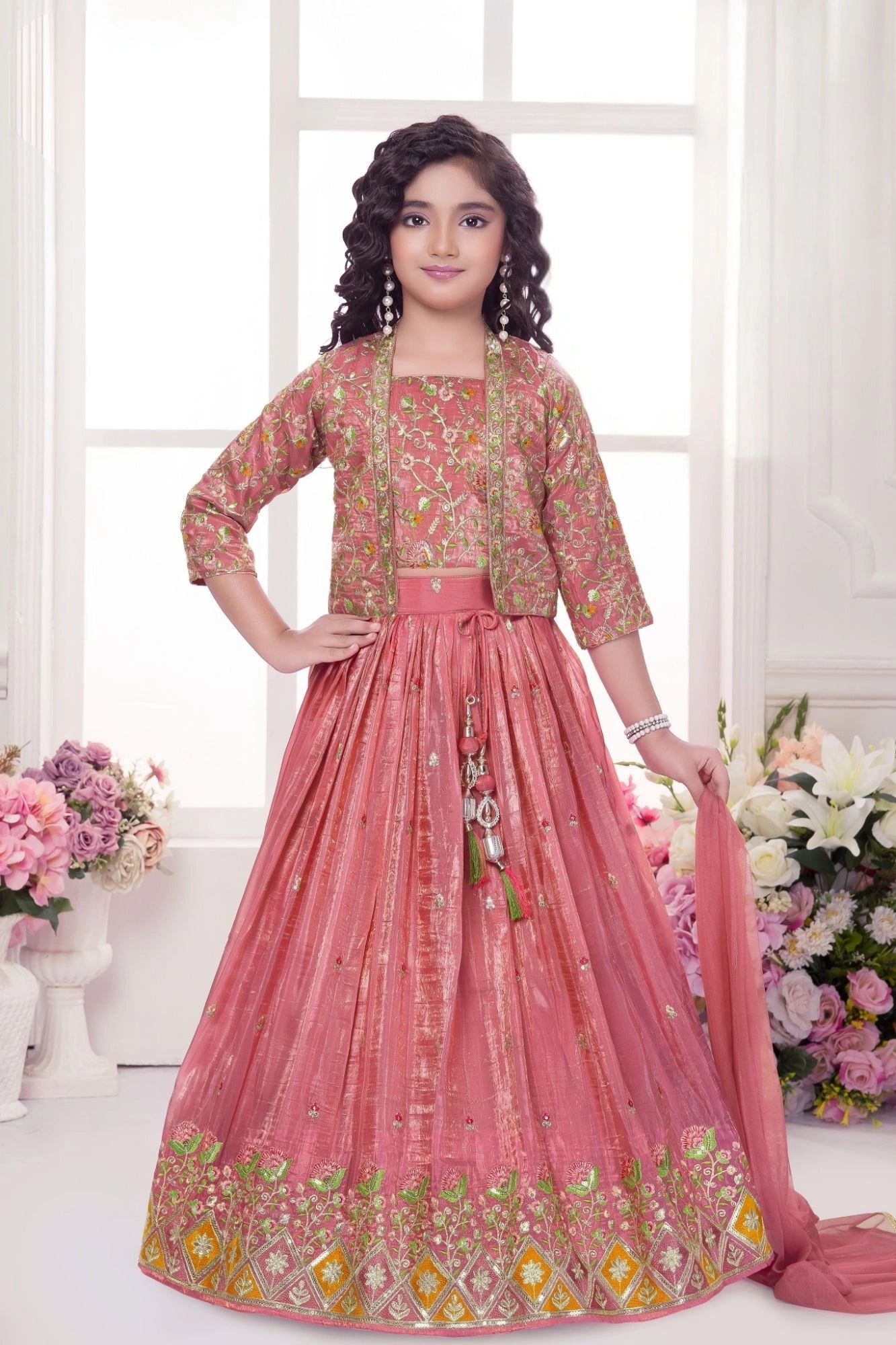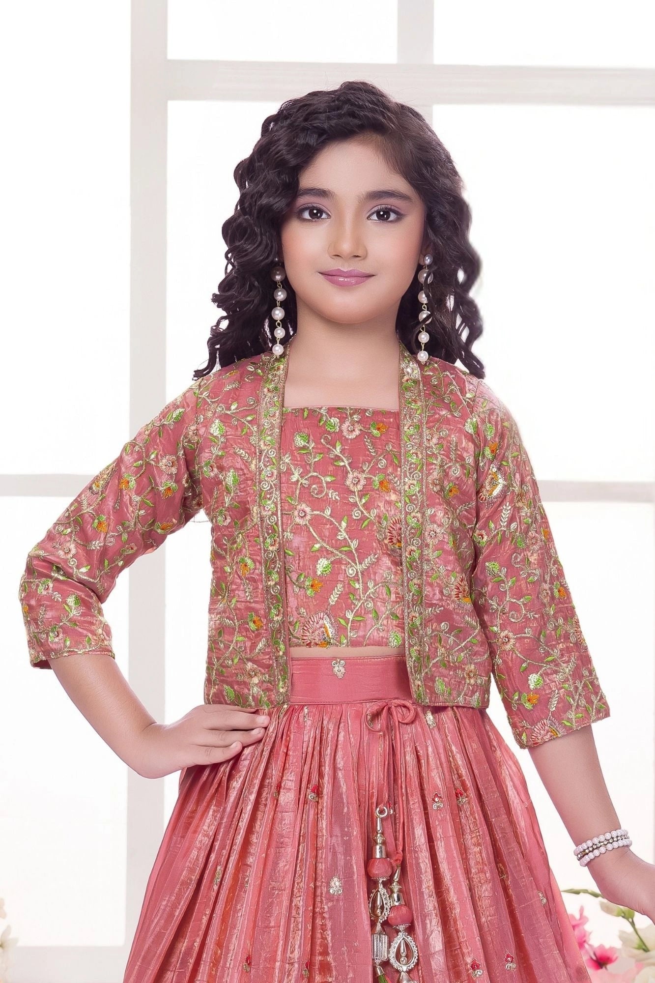 Peach Heavy Embroidered Lehenga Choli Set With Jacket for Girls