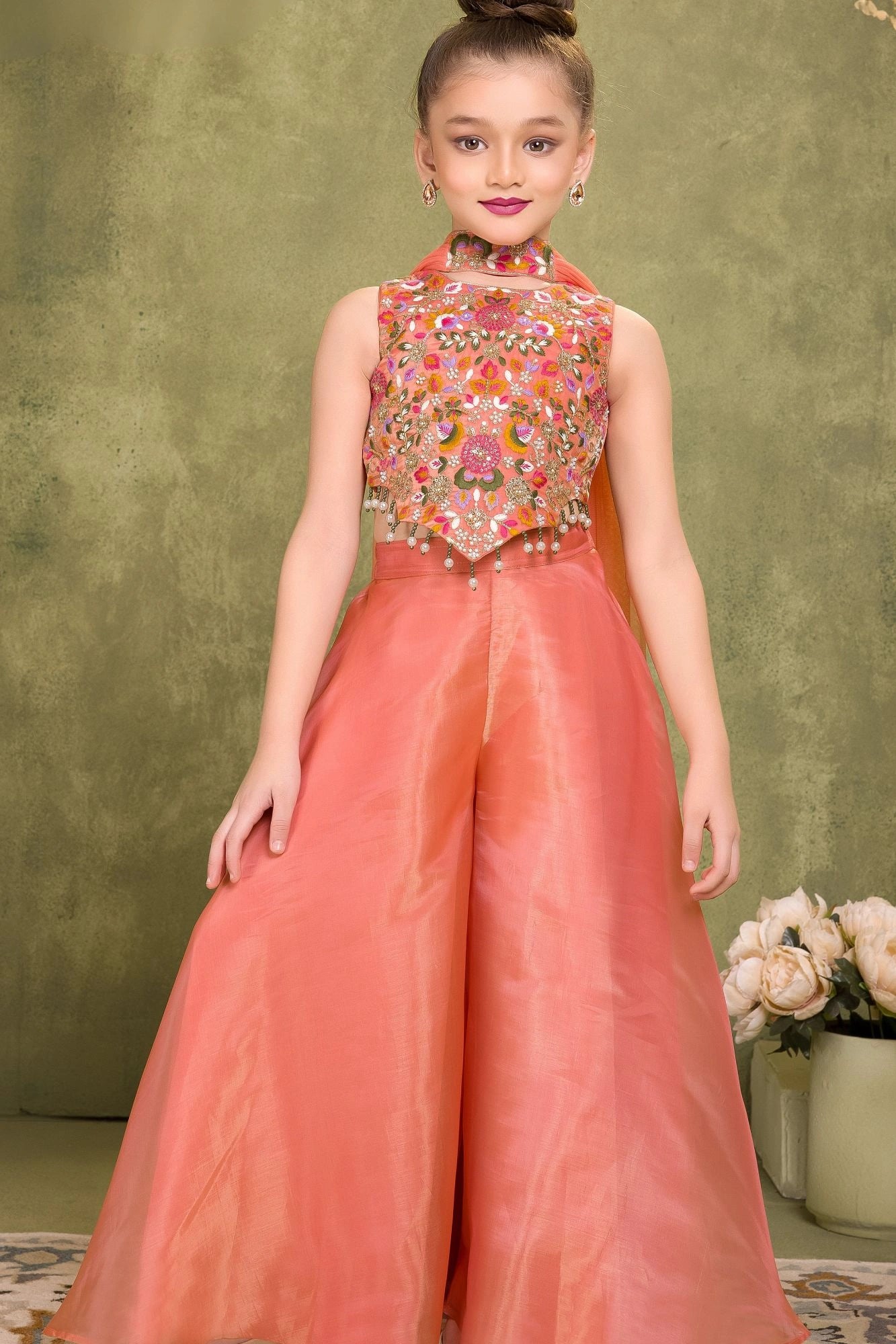 Peach Sequins Work With Thread Embroidery For Palazzo Set For Girls