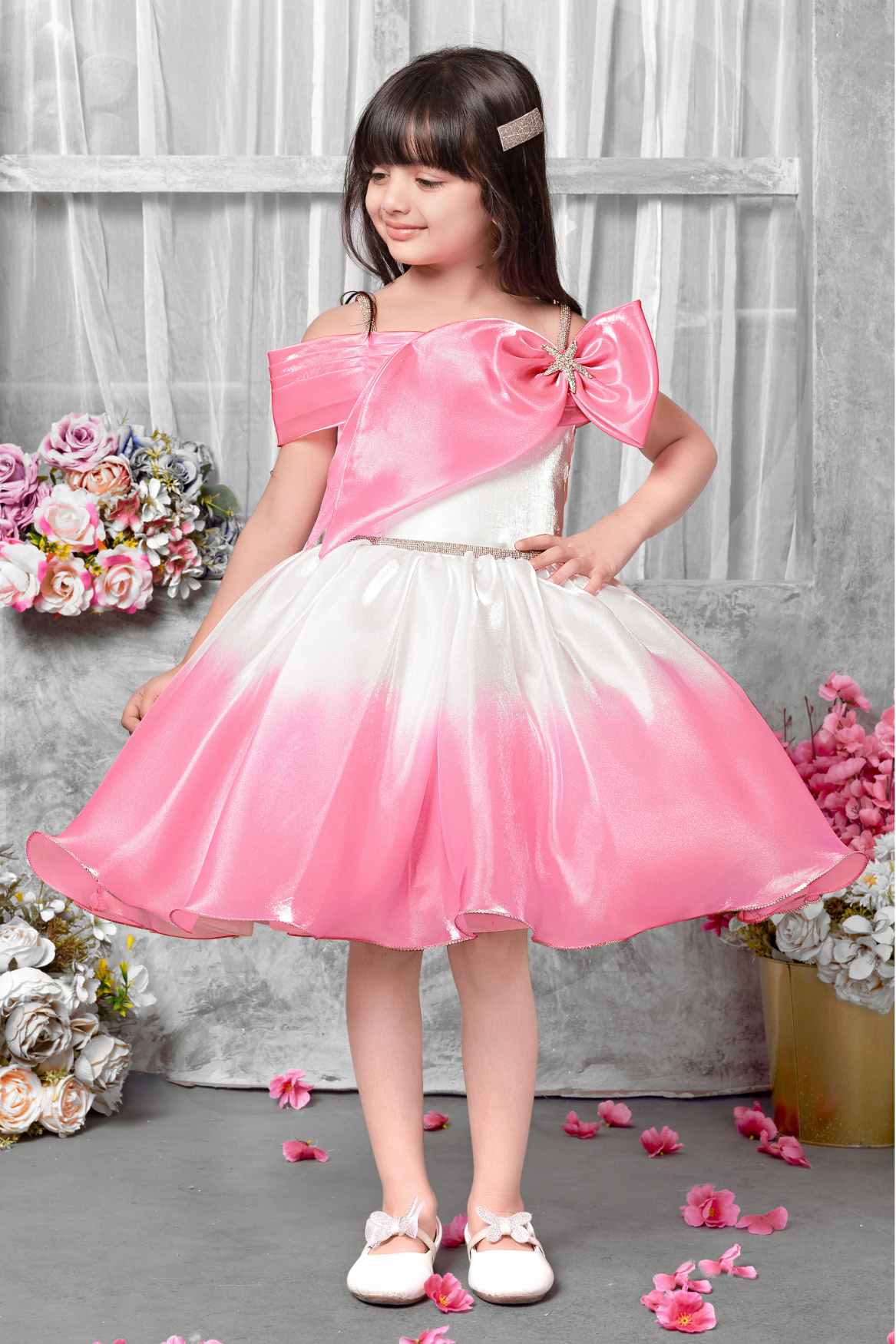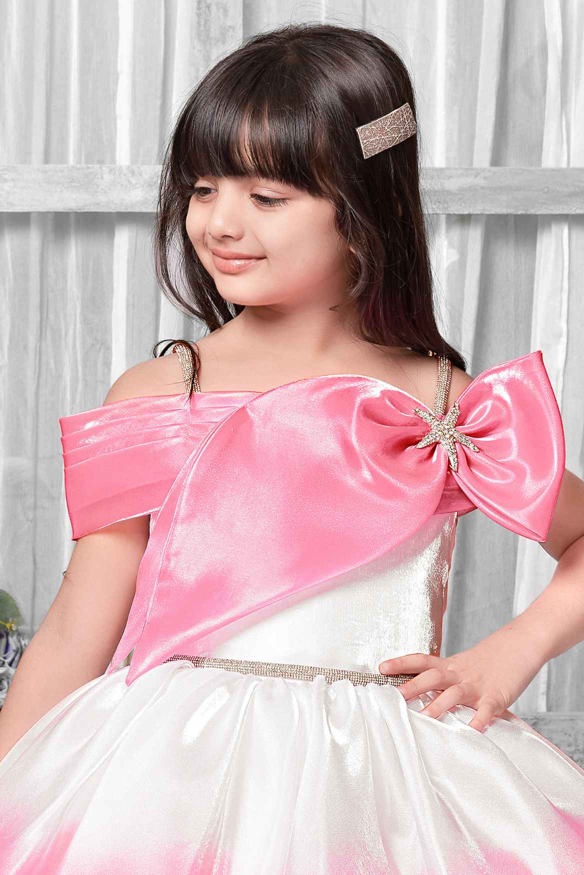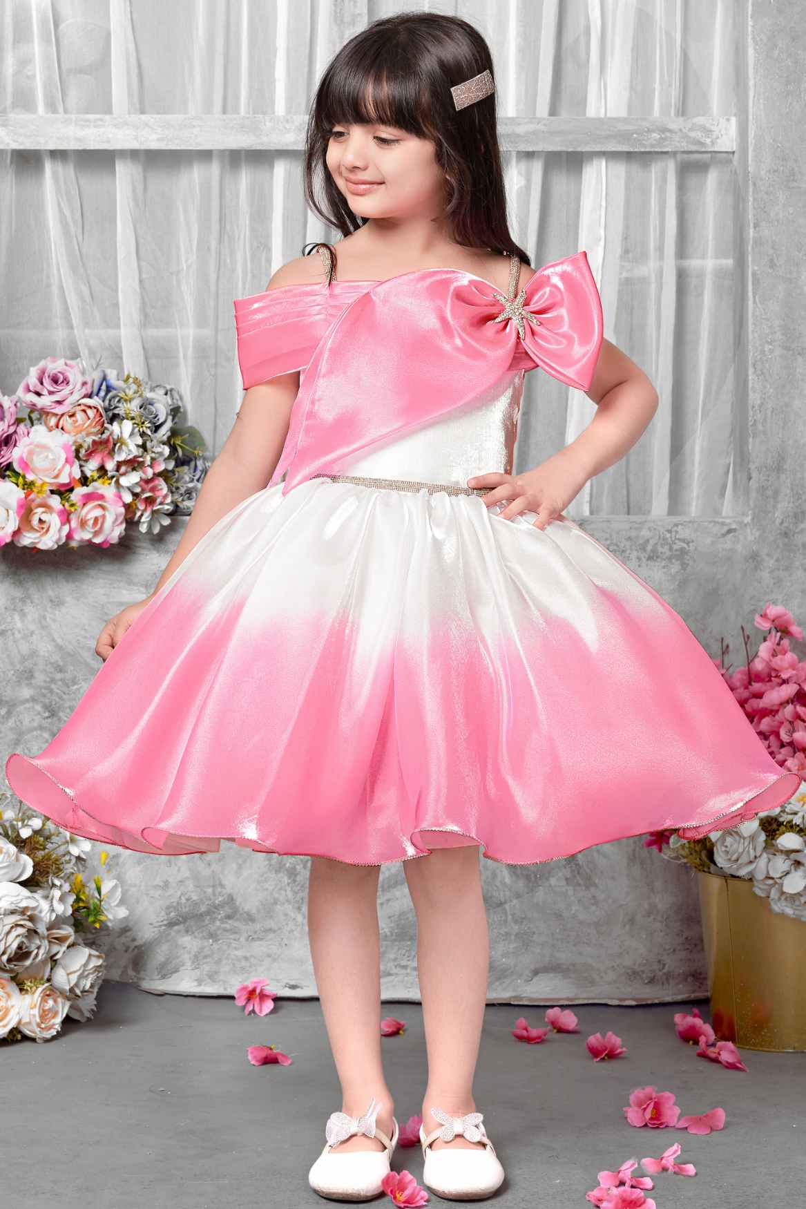 Pink And White Off-Shoulder Party Frock For Girls