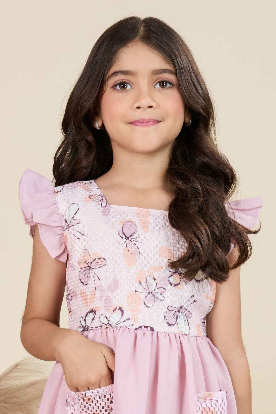 Lavender Floral Embellished Party Wear Frock With Sequin Detailing For Girls