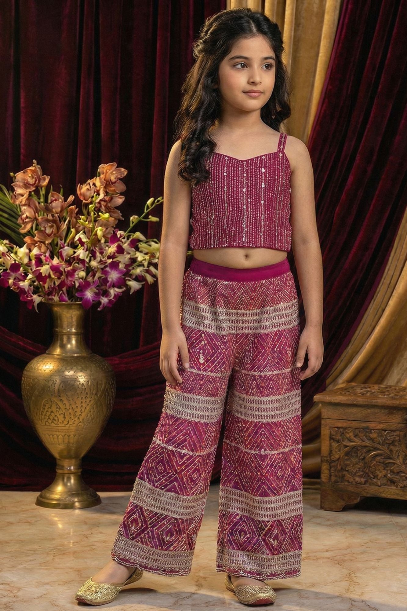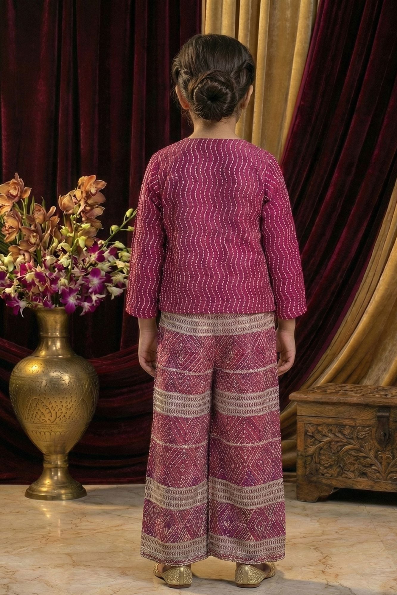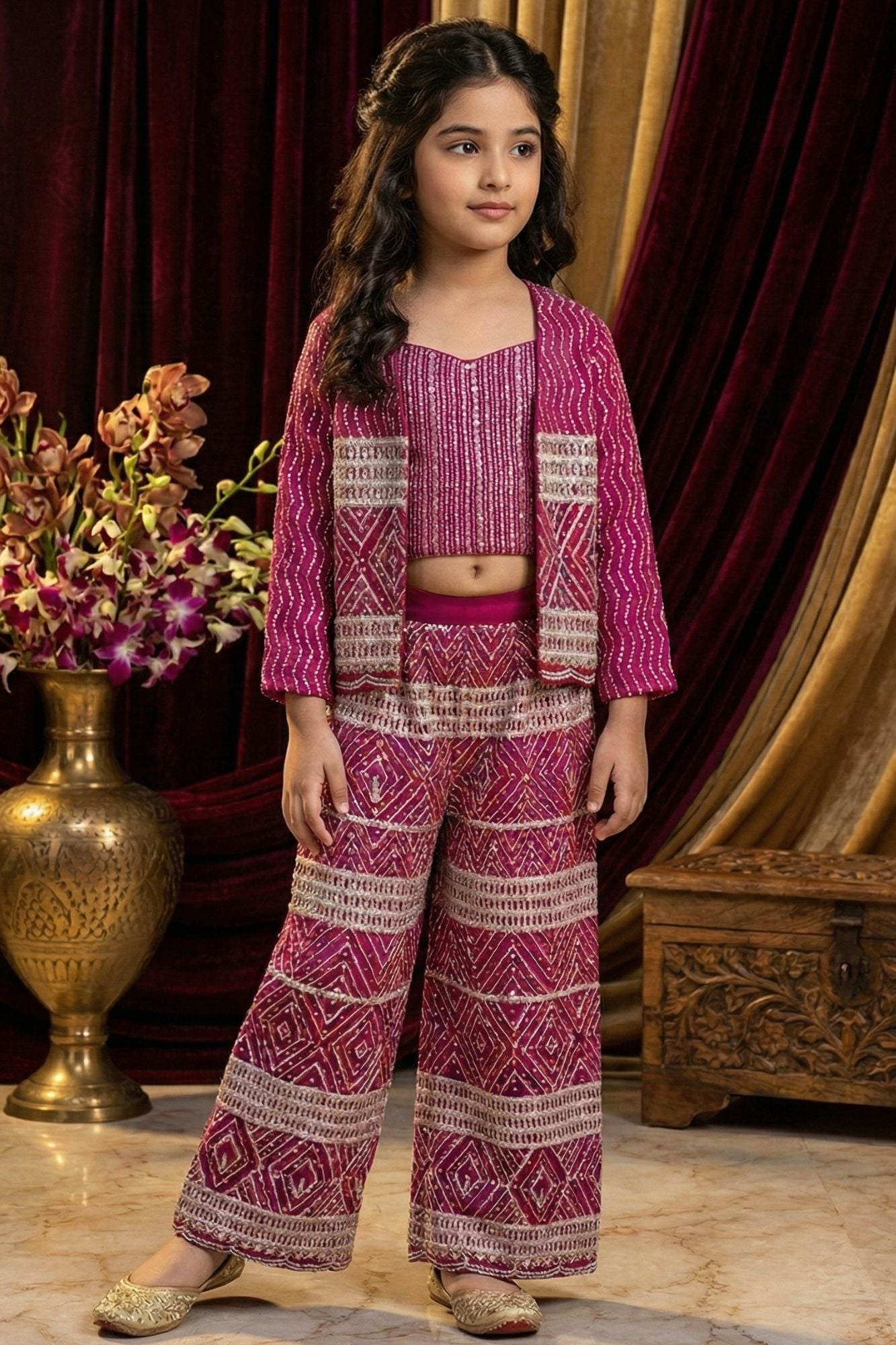 Pink Heavy Embroidered Palazzo Set with Embroidered Jacket For Girls
