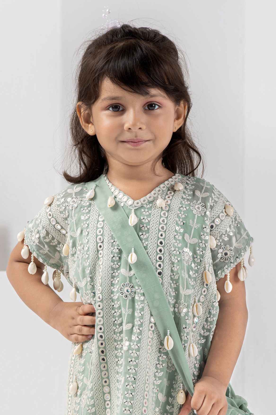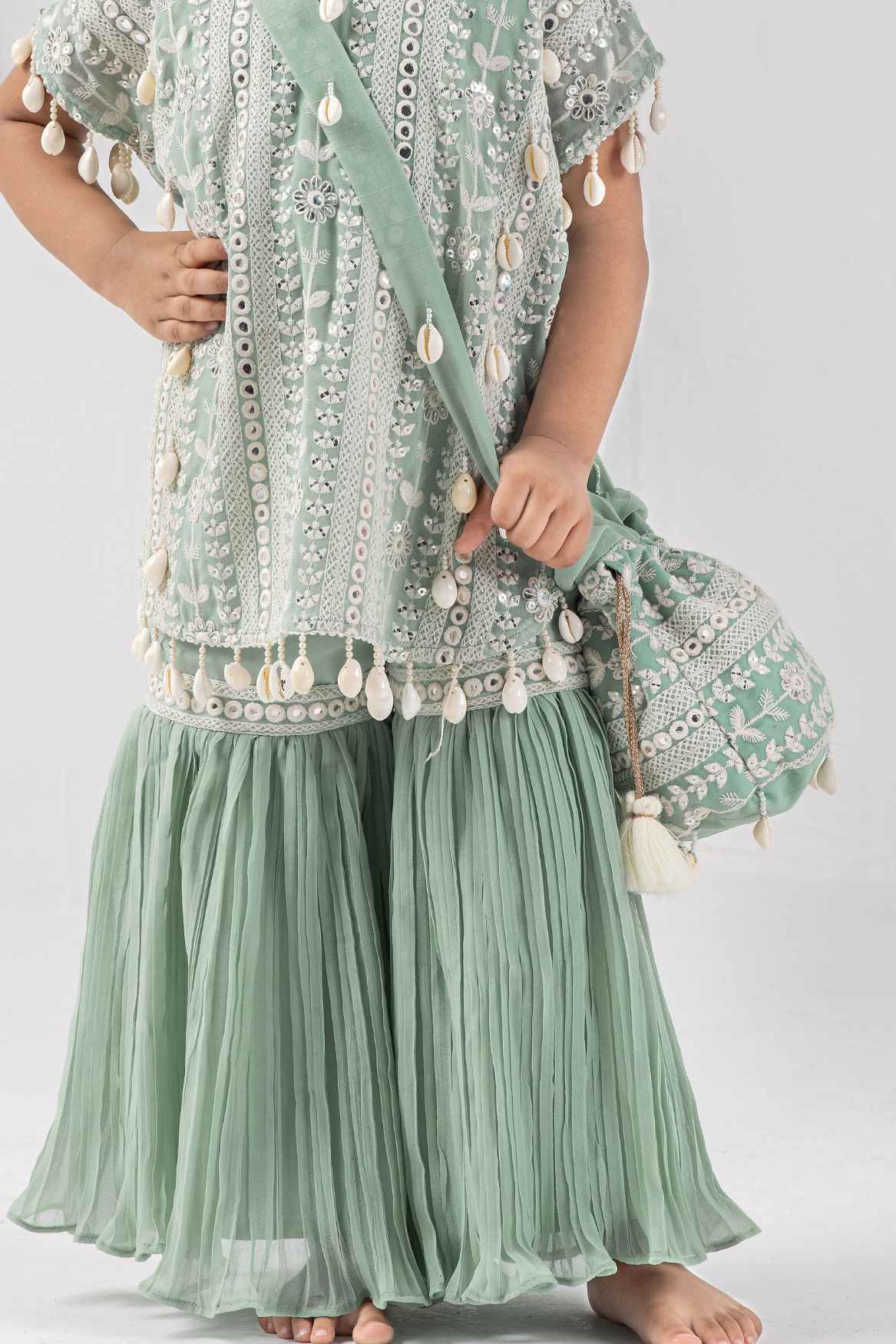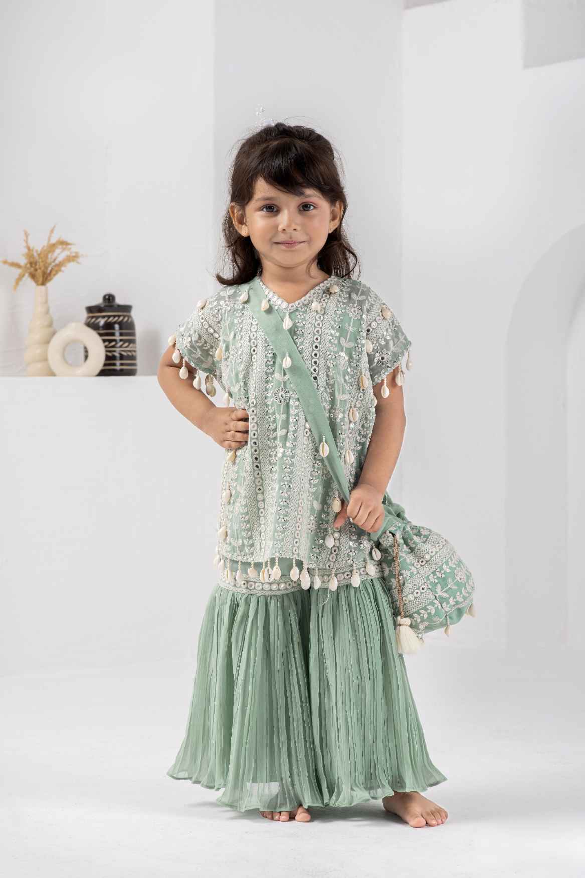 Pista Green Embroidered And Mirror Work Top With Sharara Set For Girls