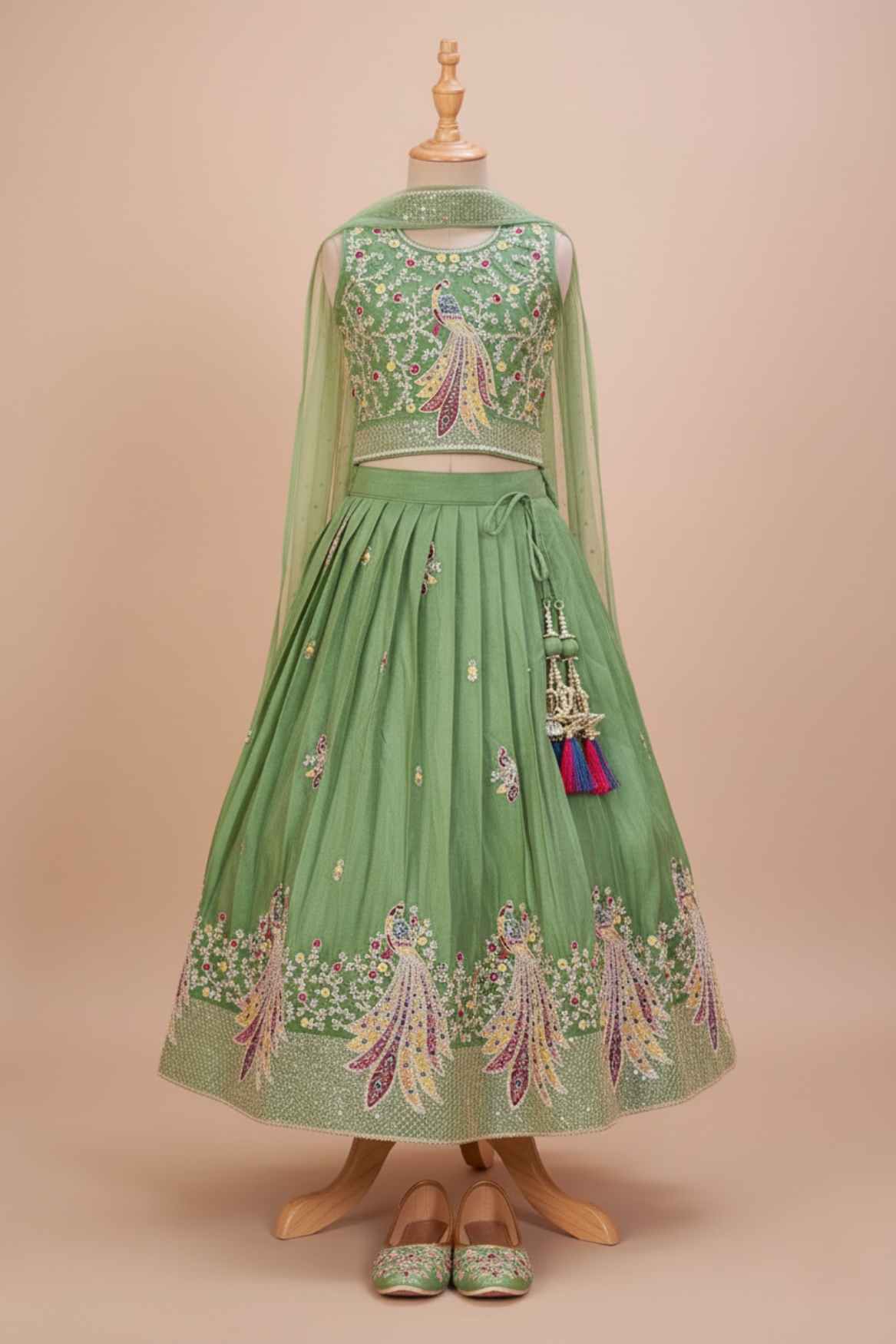 Pista Green Peacock Embroidered Lehenga Choli with Dupatta For Girls