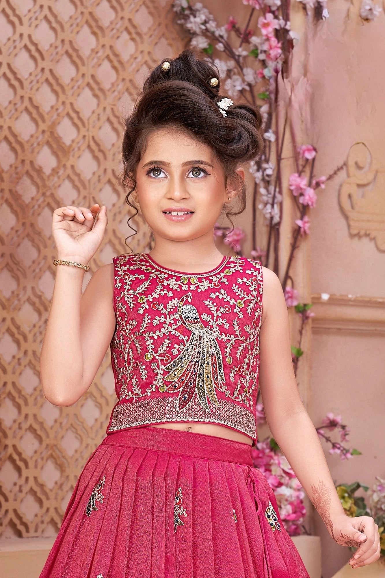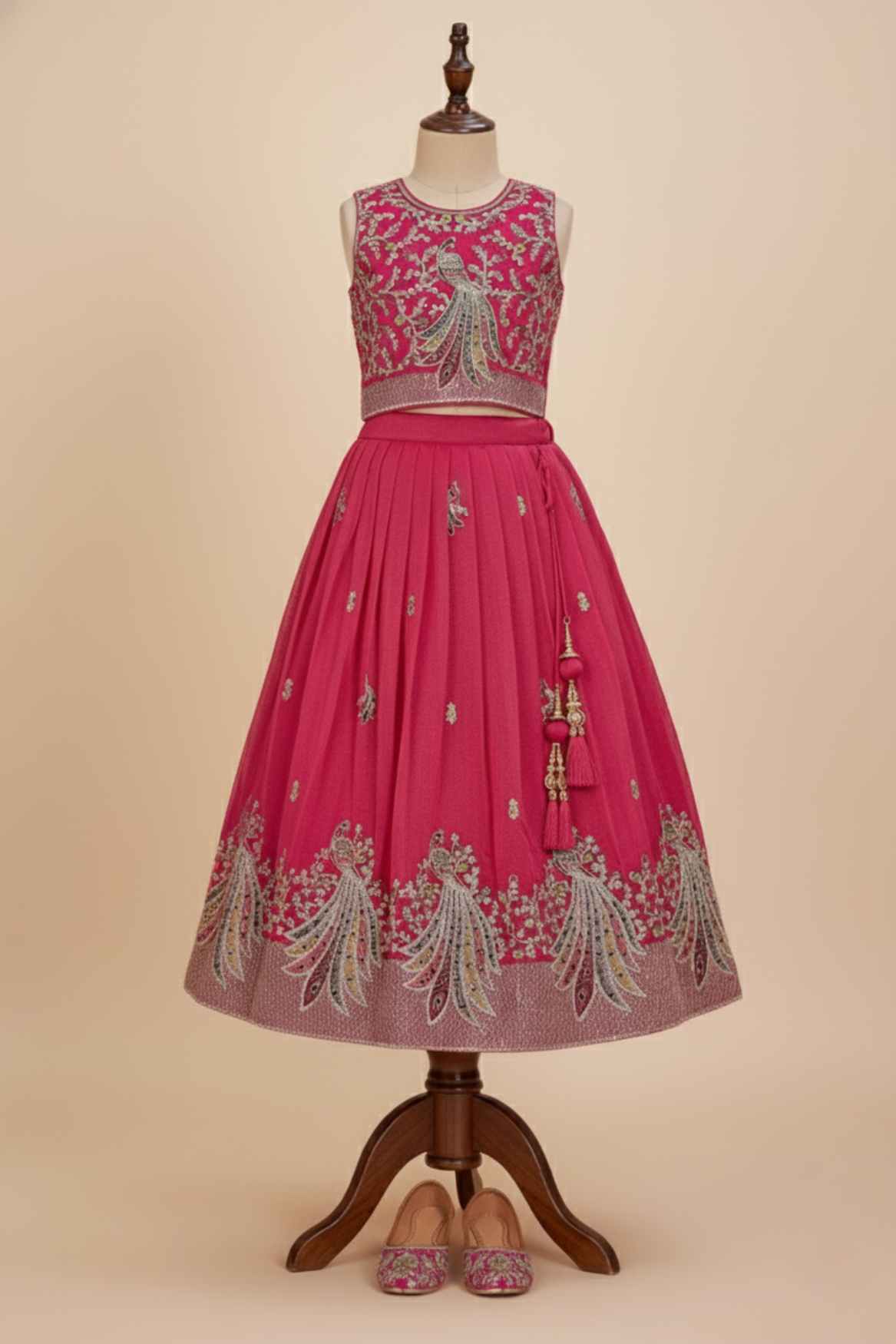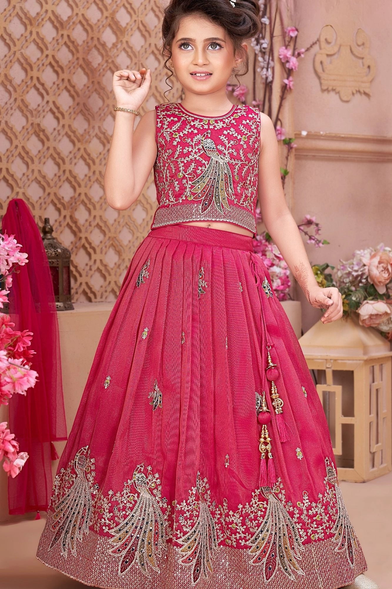 Rani Pink Peacock Embroidered Lehenga Choli with Dupatta For Girls