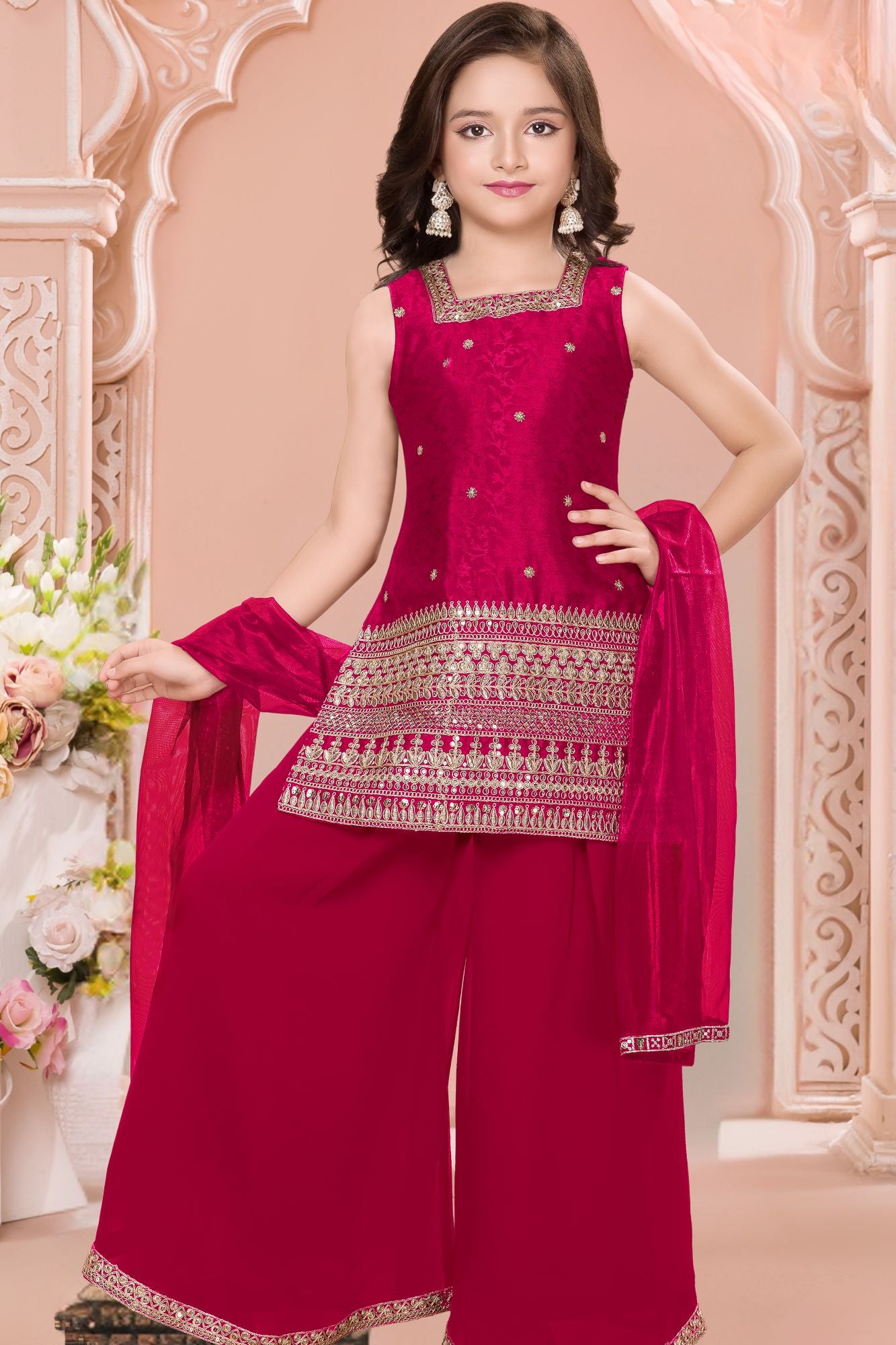 Rani Pink Embroidered Palazzo Set For Girls