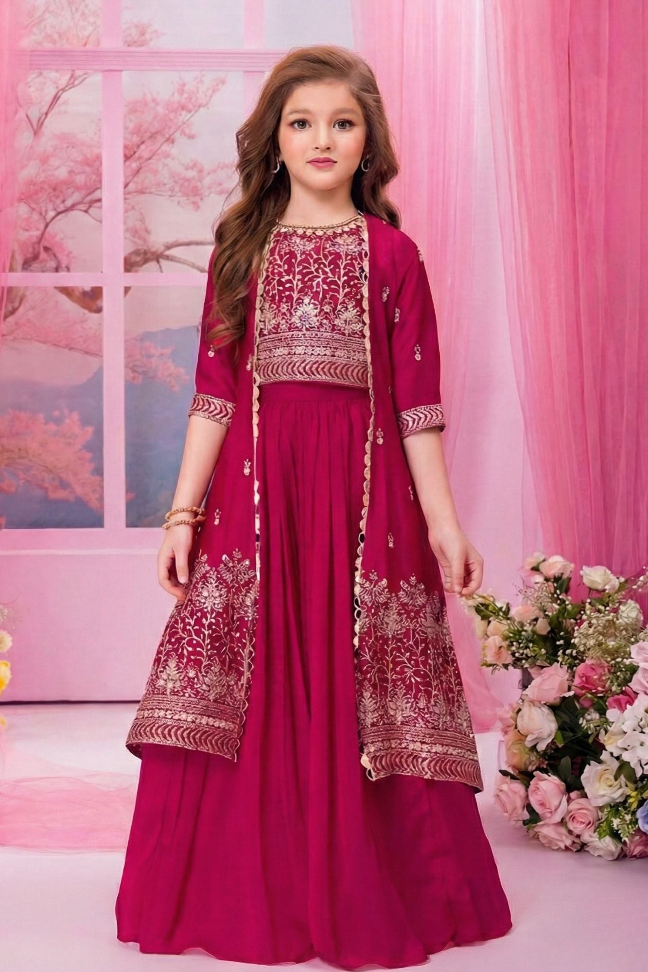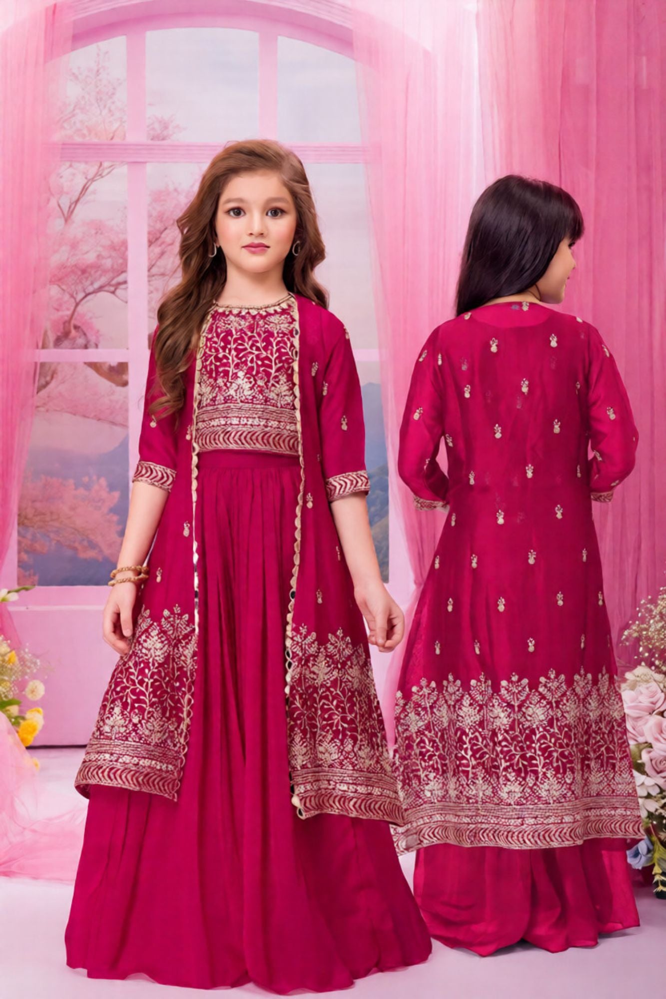 Rani Pink Embroidered Palazzo Set with Jacket For Girls