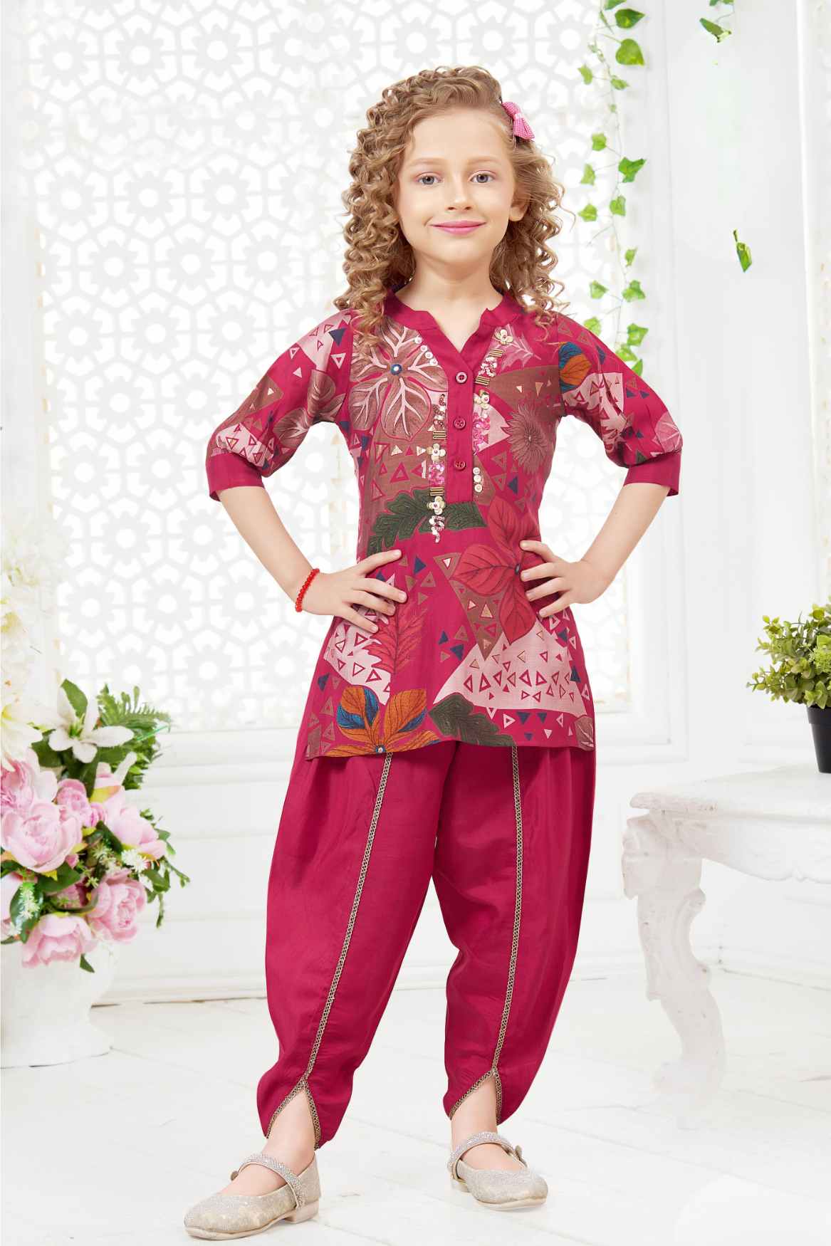 Rani Pink Floral Printed And Sequins Work Dhoti Set For Girls