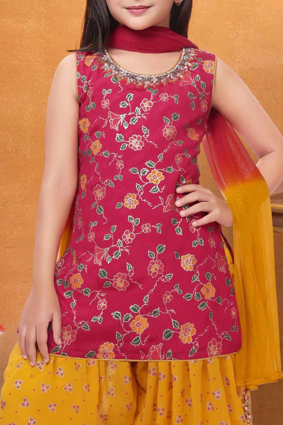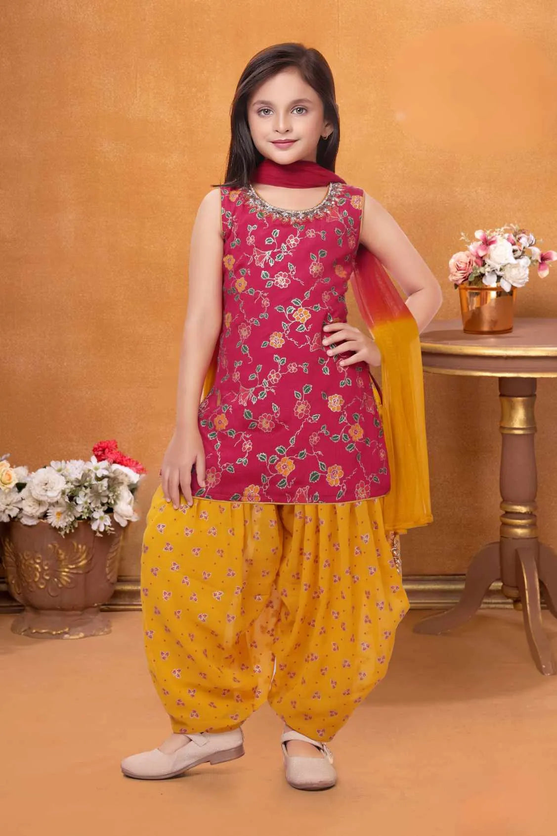 Rani Pink Kurti With Gold Patiala Suit Set For Girls