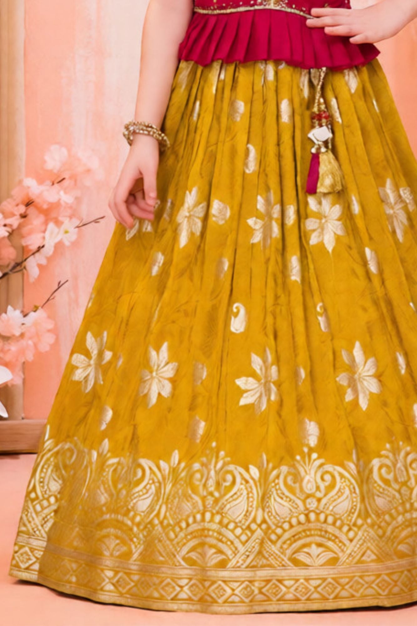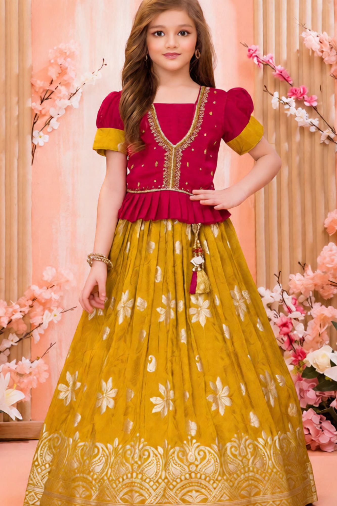 Rani Pink & Mustard Silk Pattu Pavadai Set with Zari Work For Girls