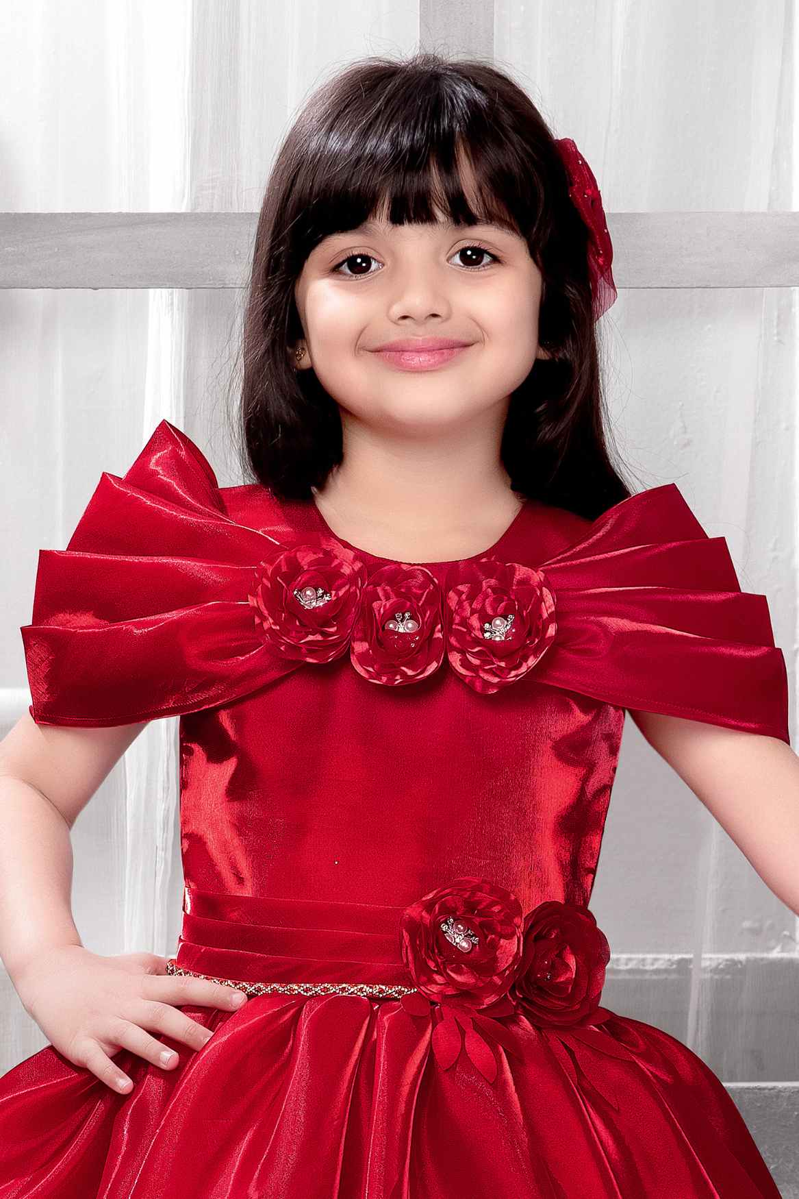 Capture the beauty of spring with our Red Gown adorned with delicate floral embellishments and pearls. Perfect for any occasion, this gown will make your little girl look and feel like a princess. Available now for a limited time only.