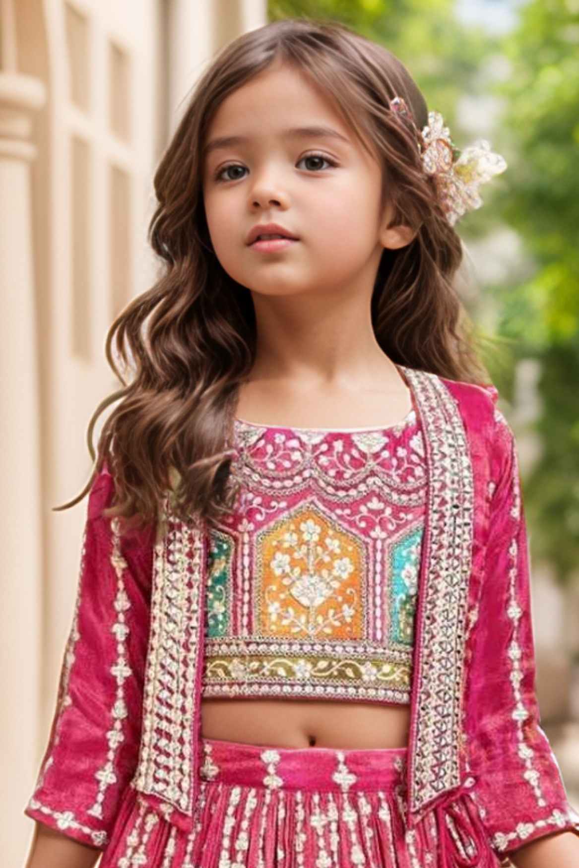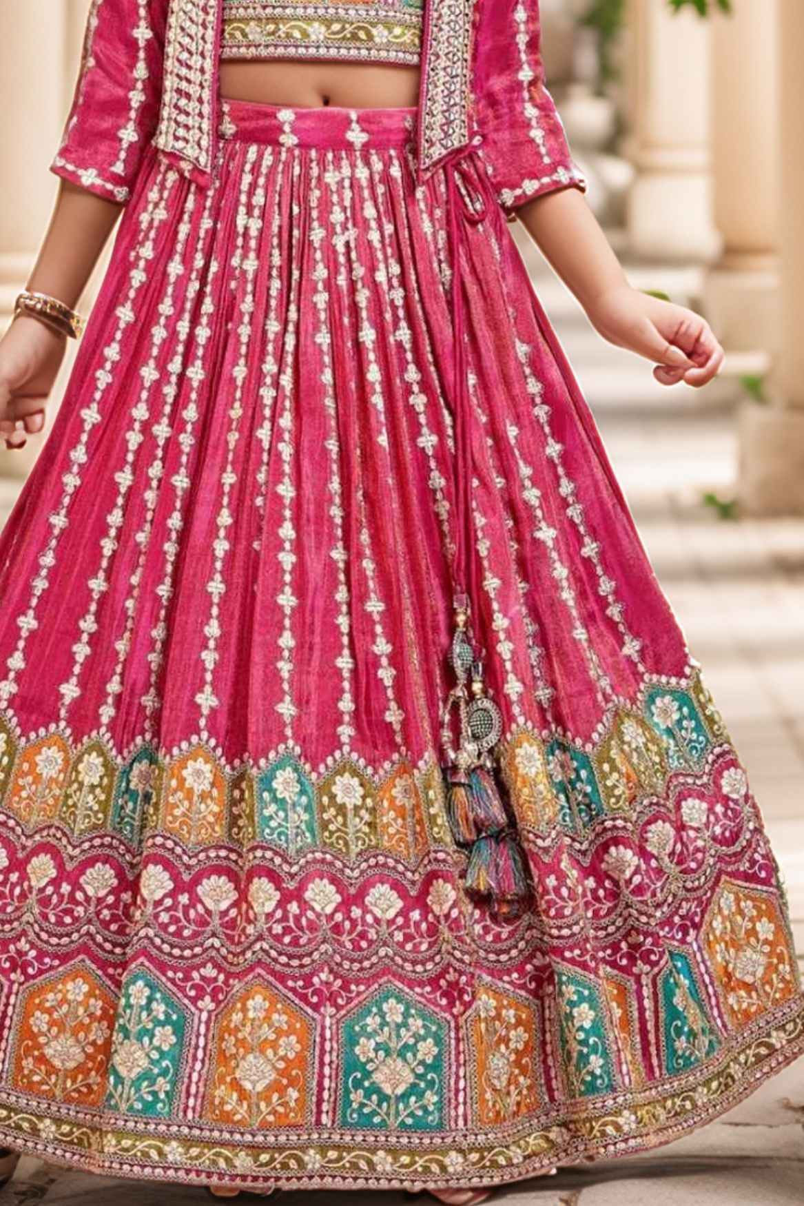 Red Sequin Work And Embroidered Lehenga Choli Set With Overcoat For Girls