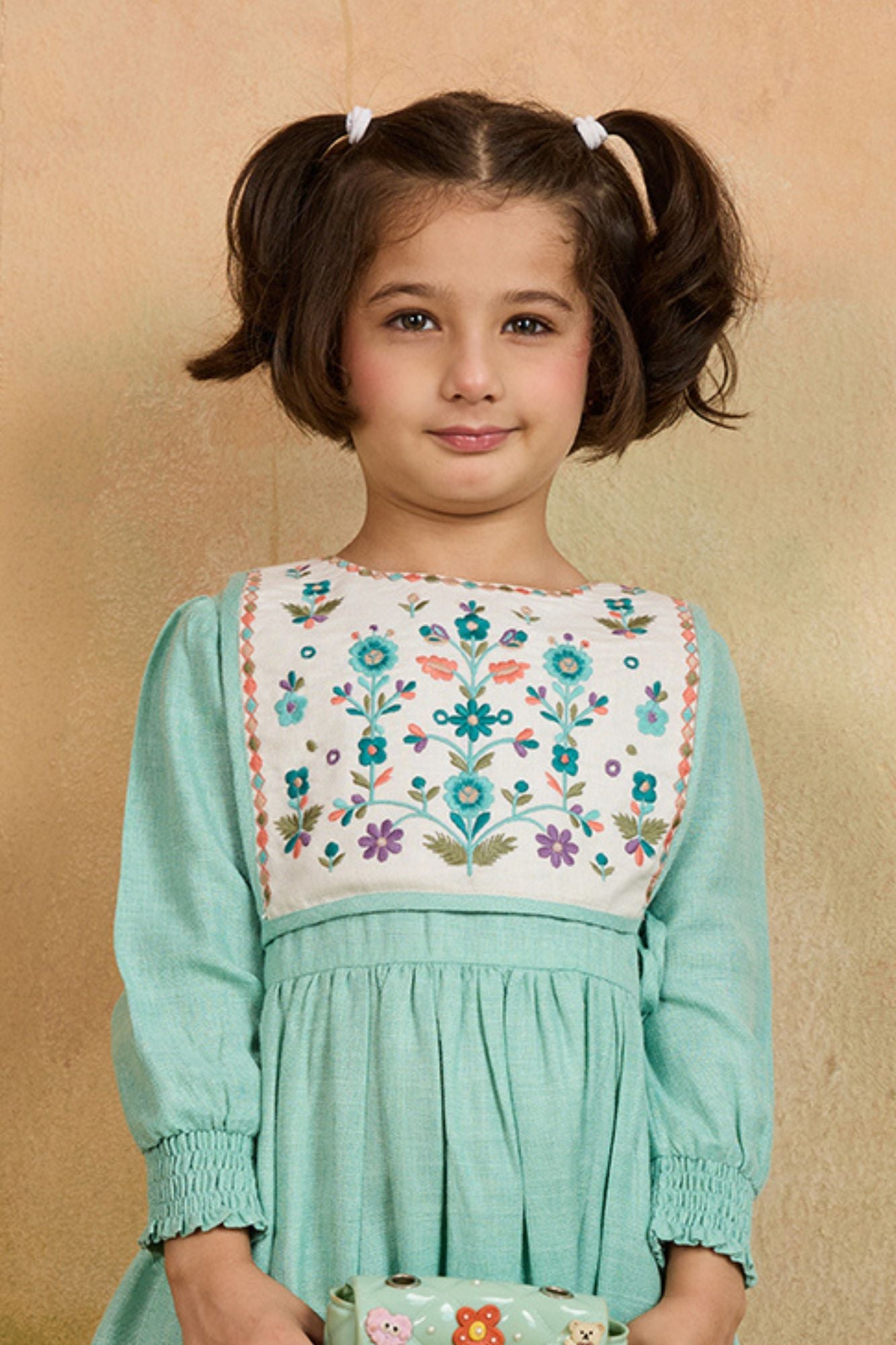 Sea Green Cotton Dress with Multicolor Floral Embroidered Yoke For Girls