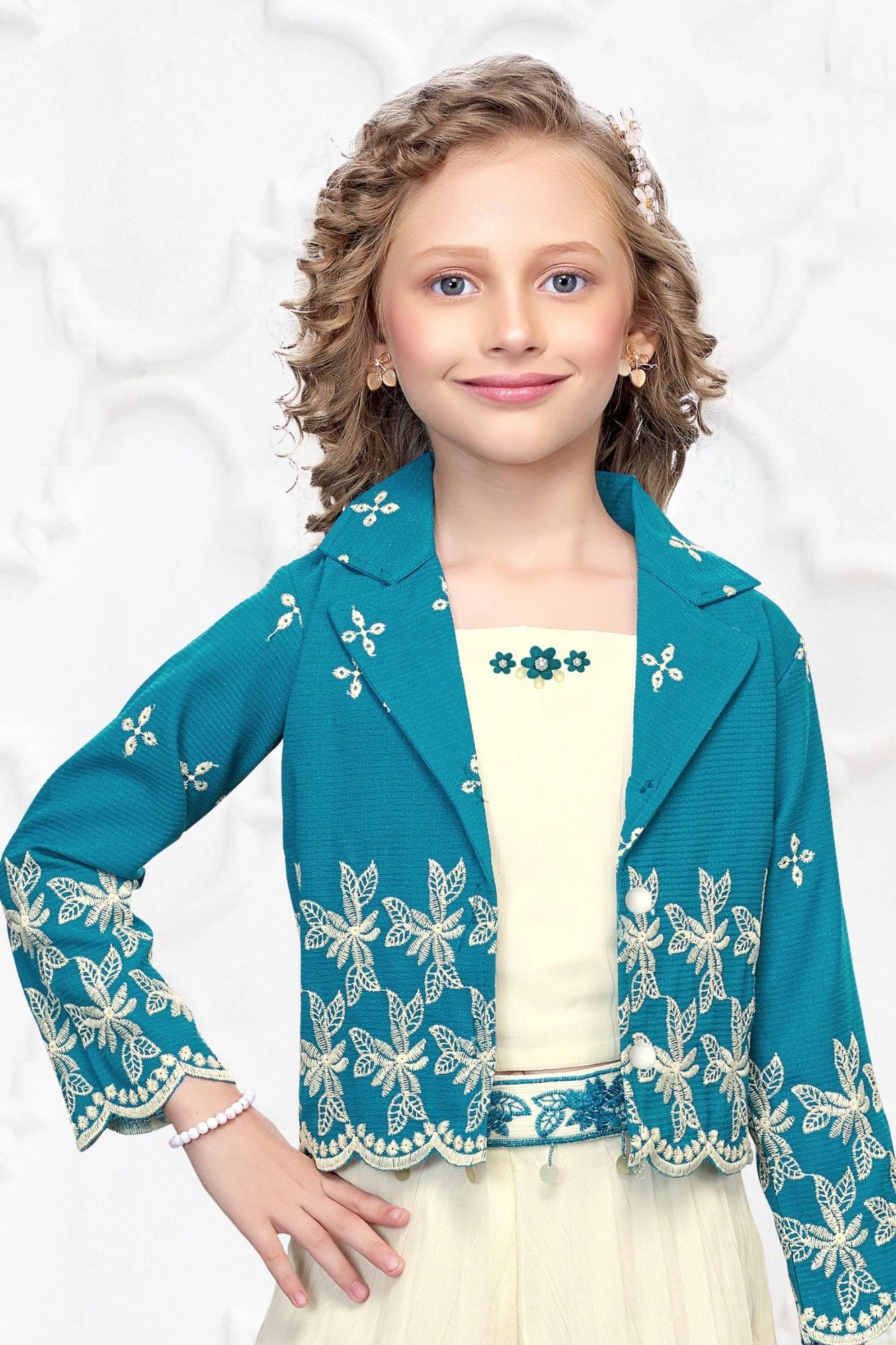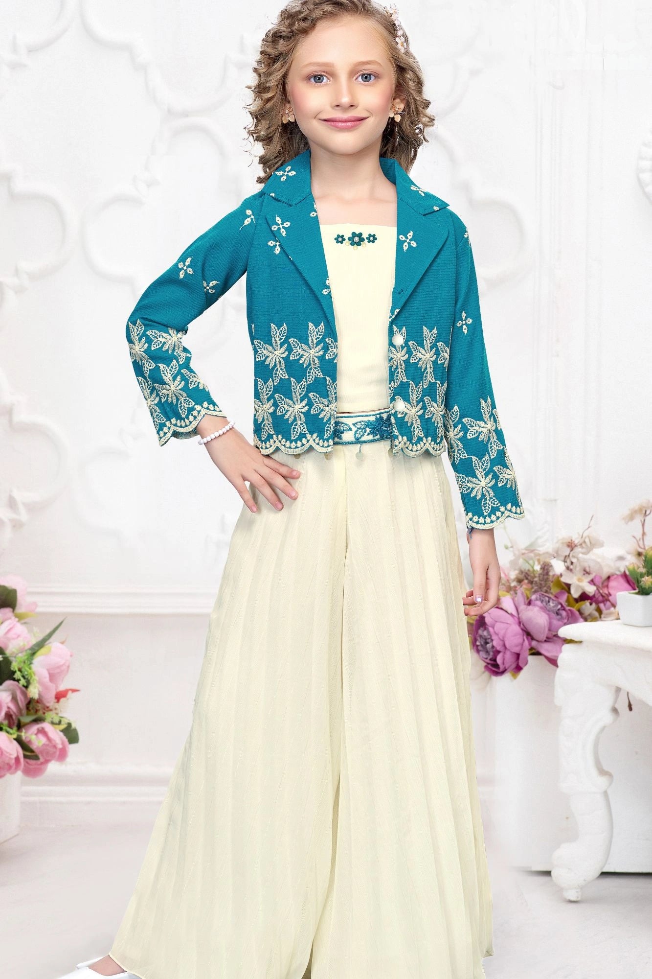 Teal Blue and Cream Embroidered Wide Legged Pant Set With Jacket For Girls