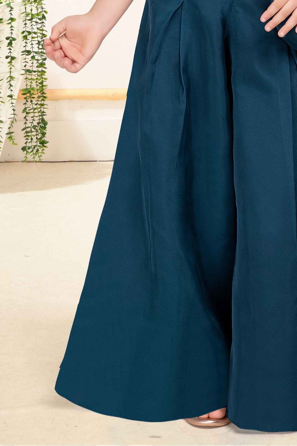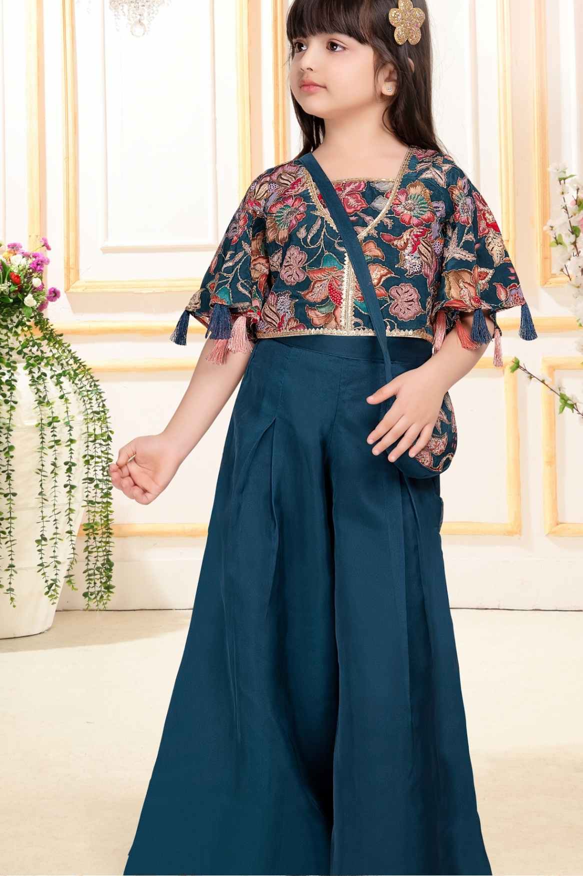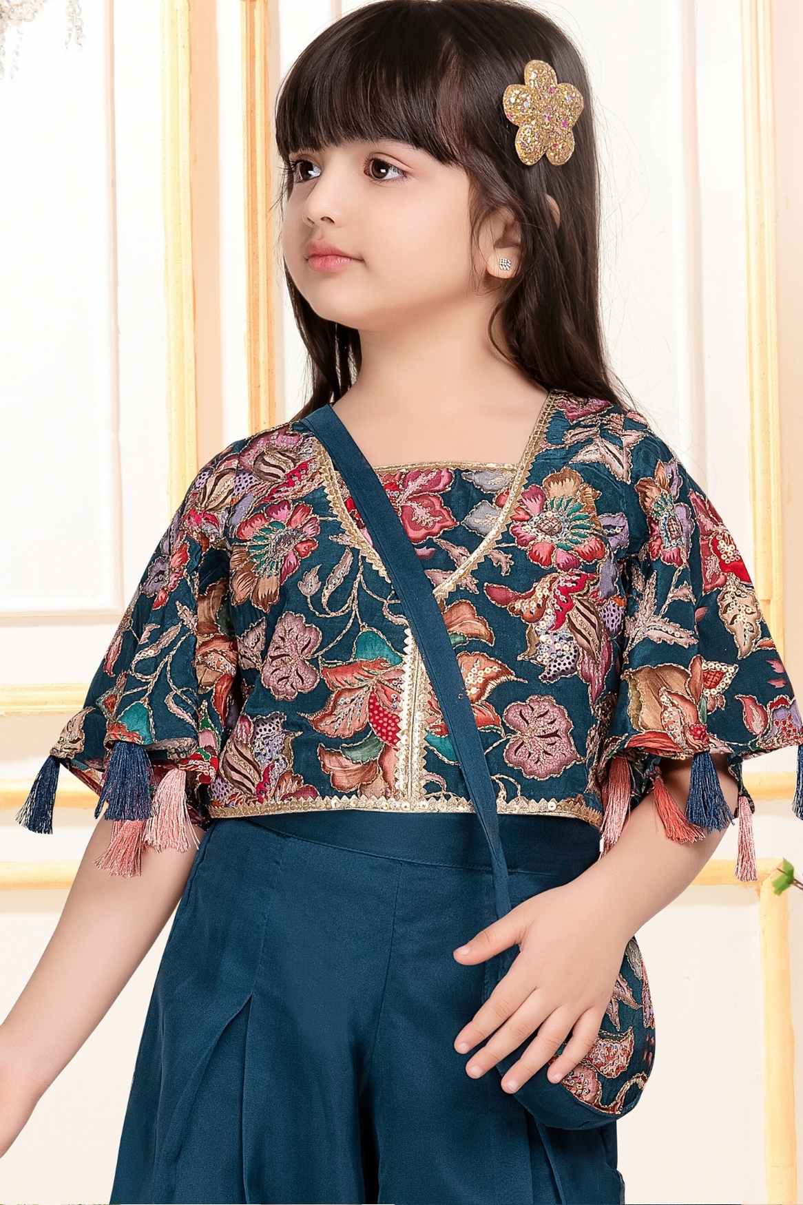 Teal Blue Sequin Embroidery Top And Palazzo Set With Sling Bag For Girls