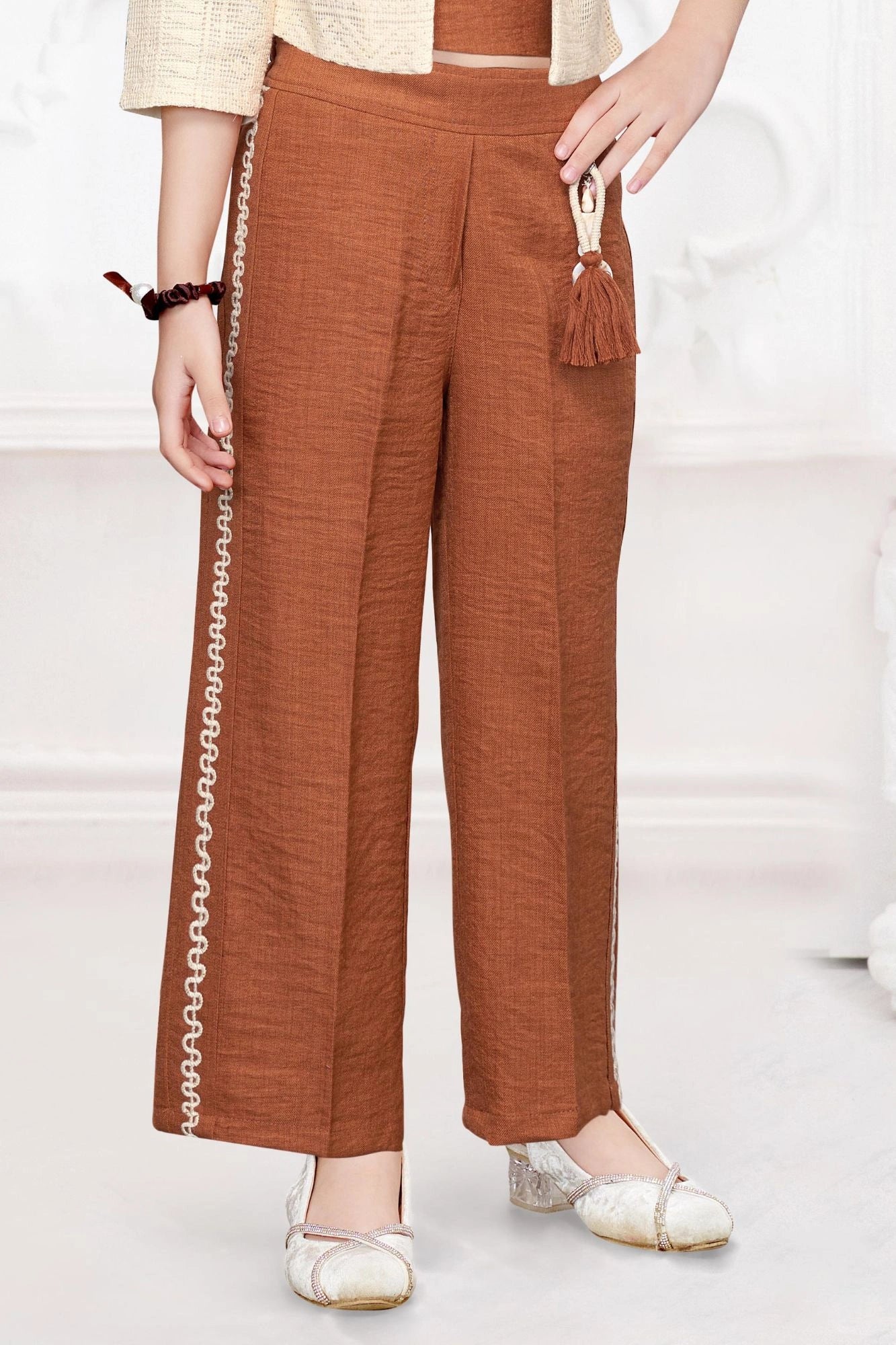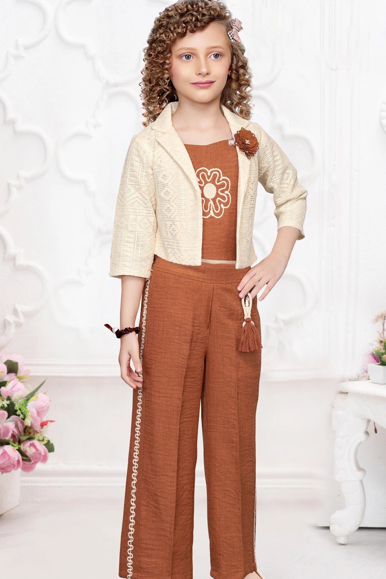 Brown Co-Ord Set with Lace Cropped Jacket For Girls
