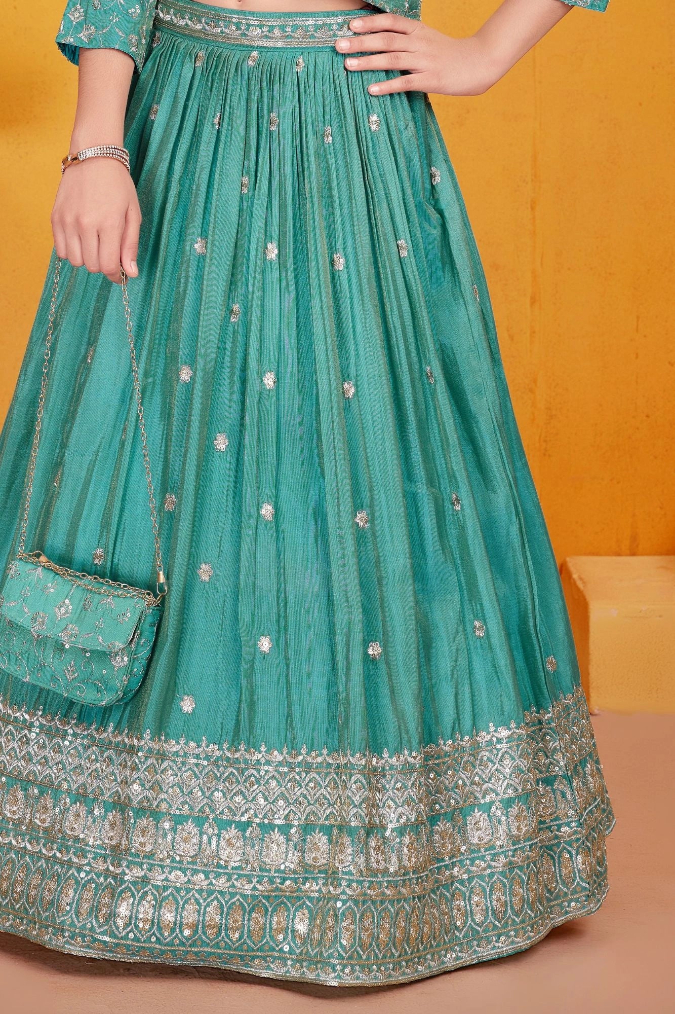 Teal Green Embroidered Lehenga Choli With Jacket For Girls
