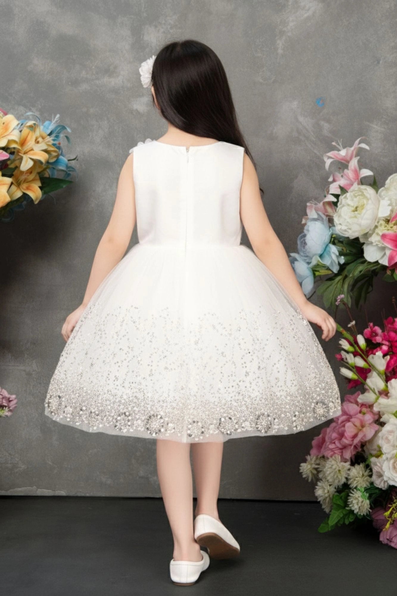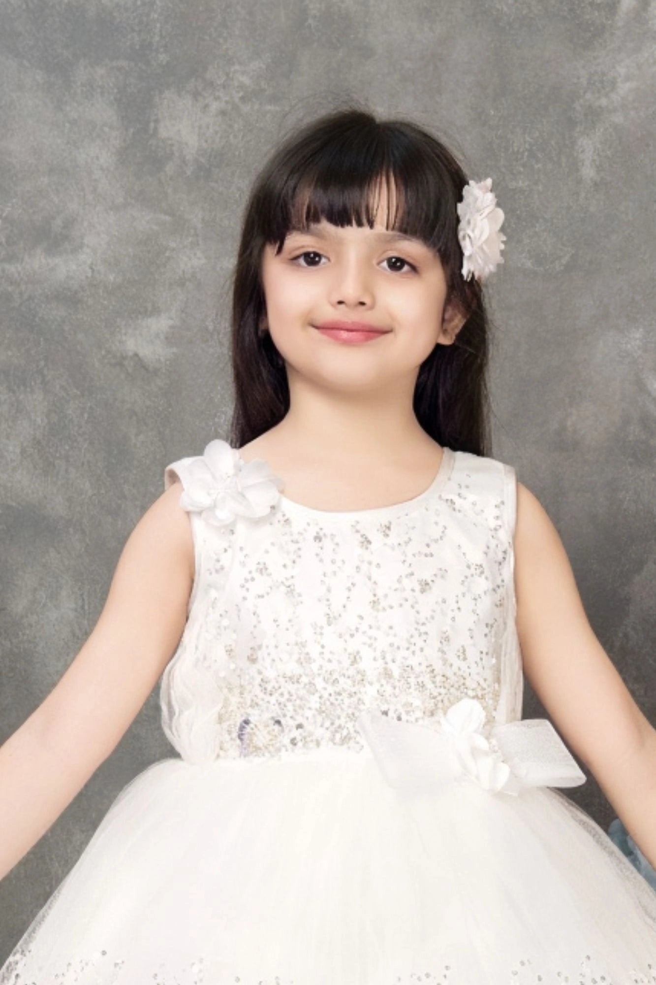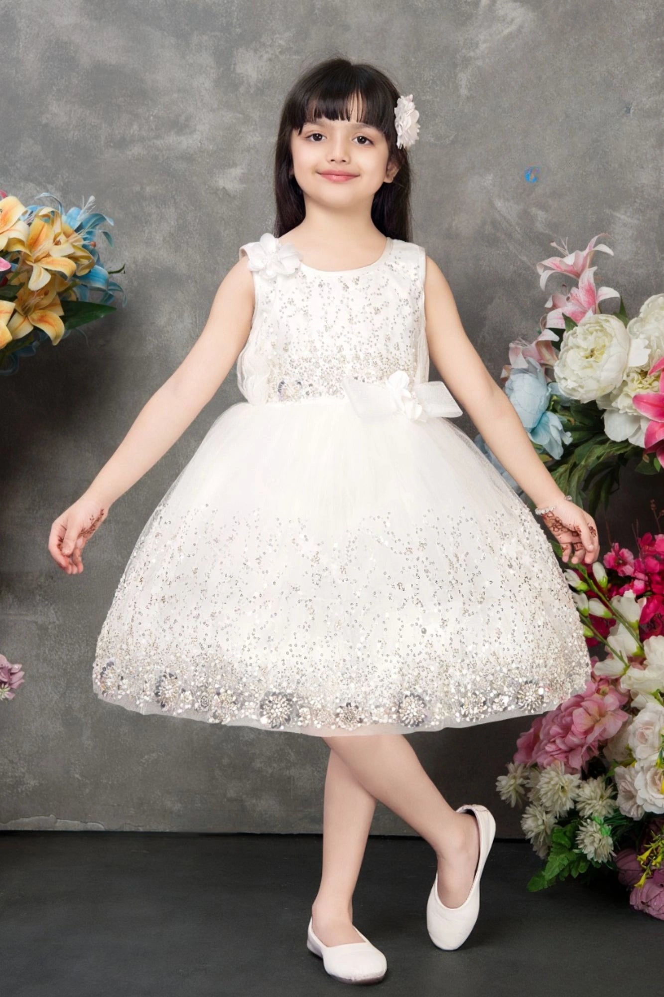 White Sequin Party Wear Frock with Floral Appliqué for Girls