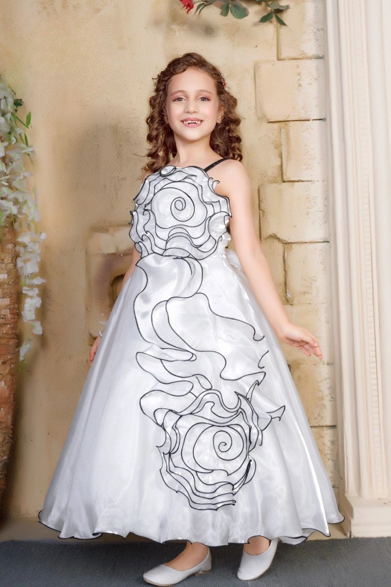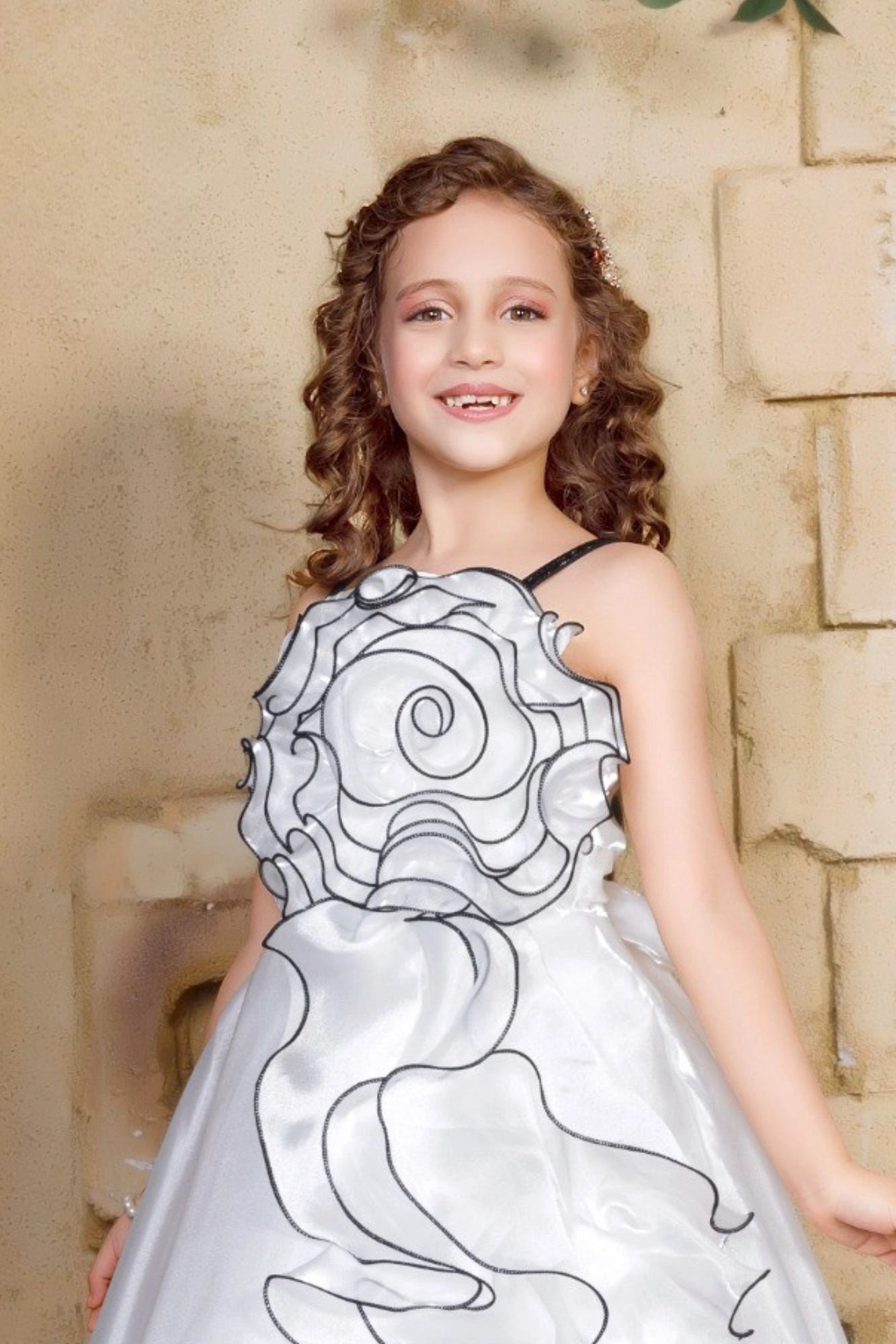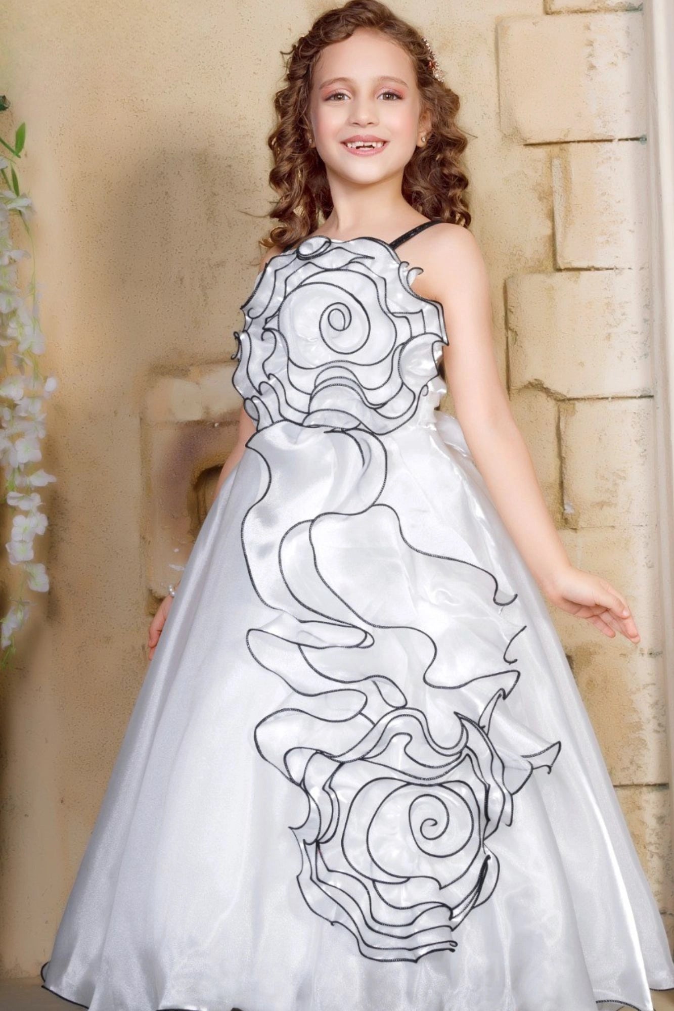 White Spiral 3D Petal Appliqué Party Gown For Girls