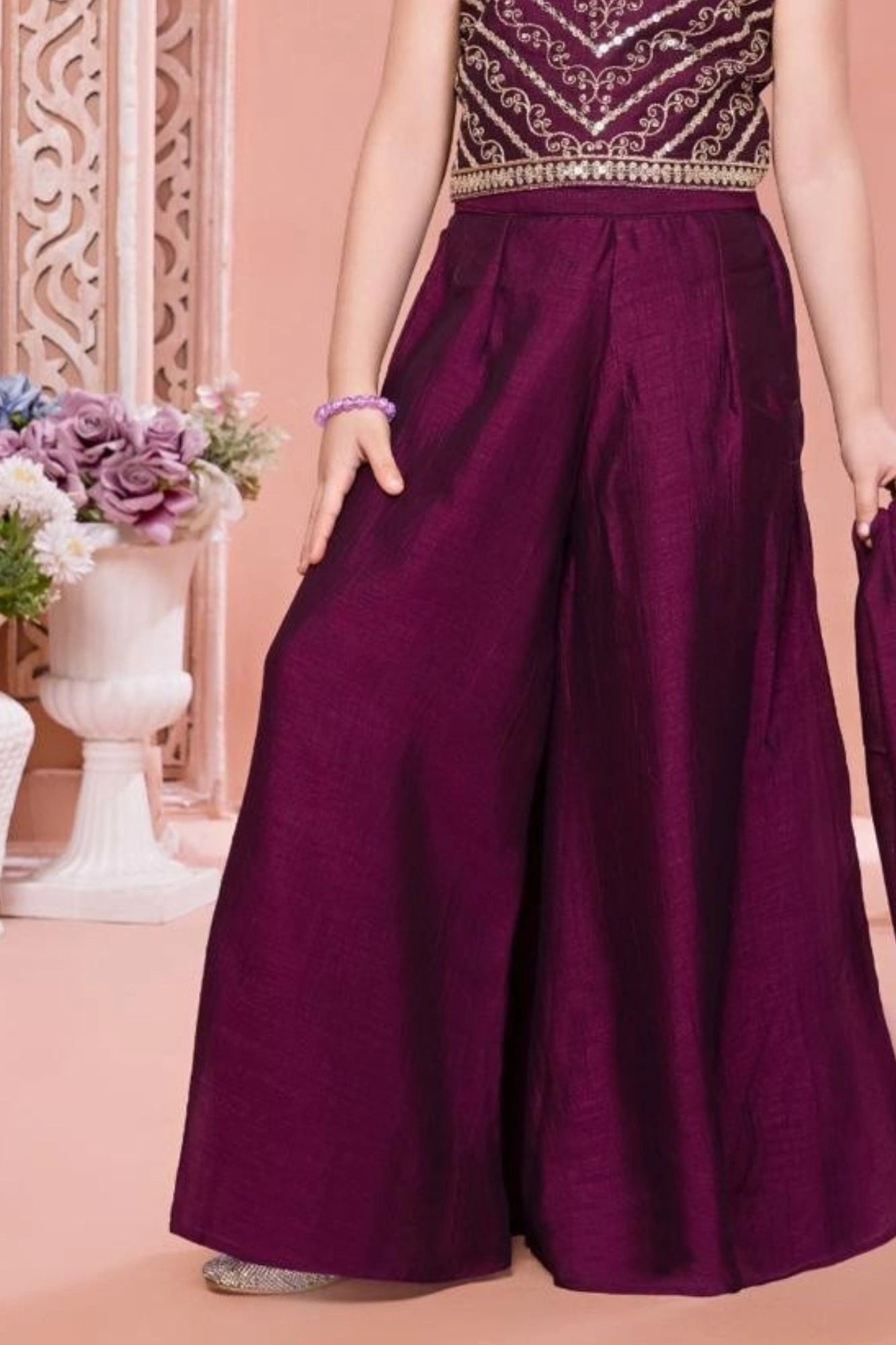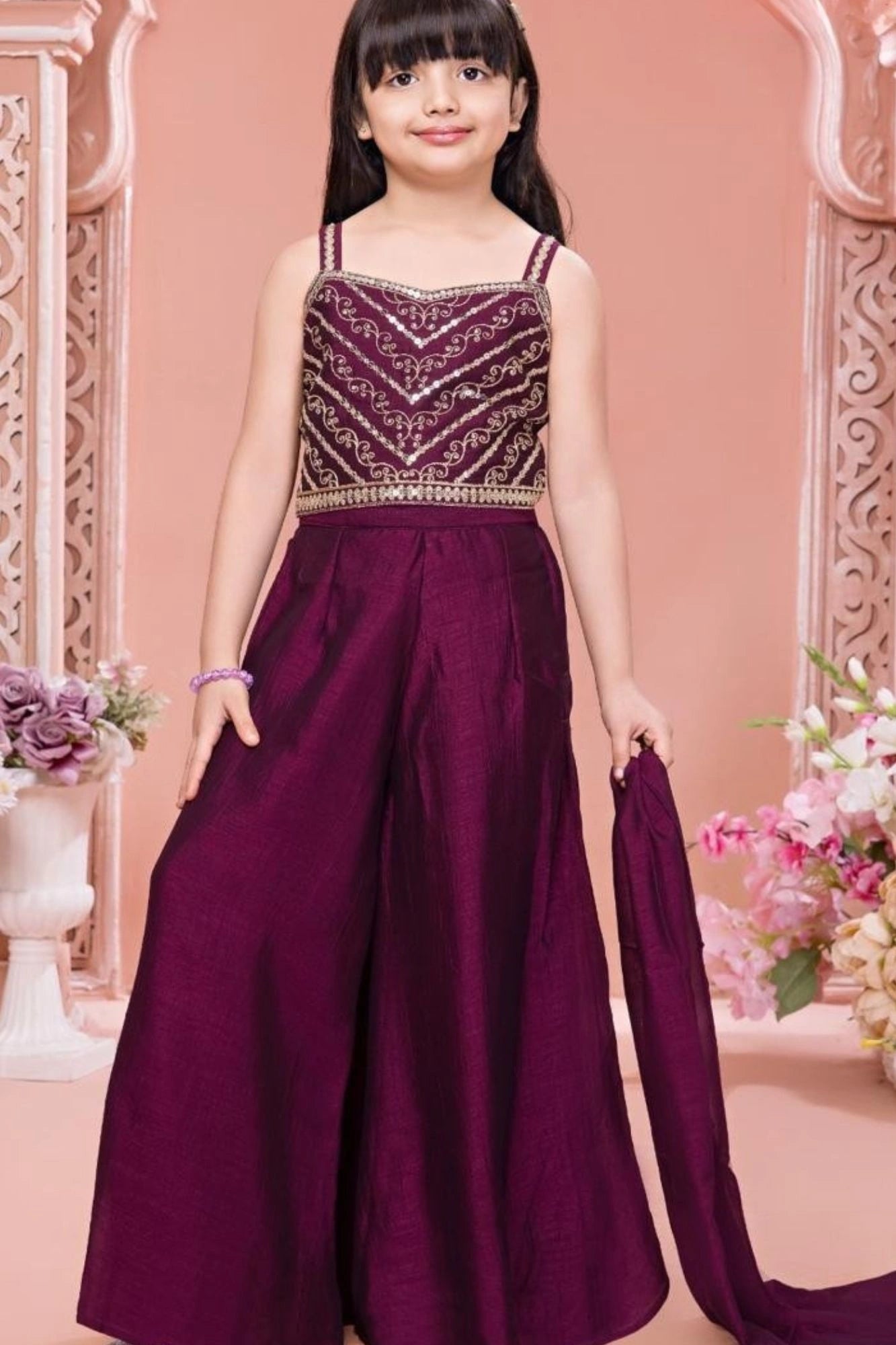 Wine Embroidered Palazzo Set With Dupatta For Girls