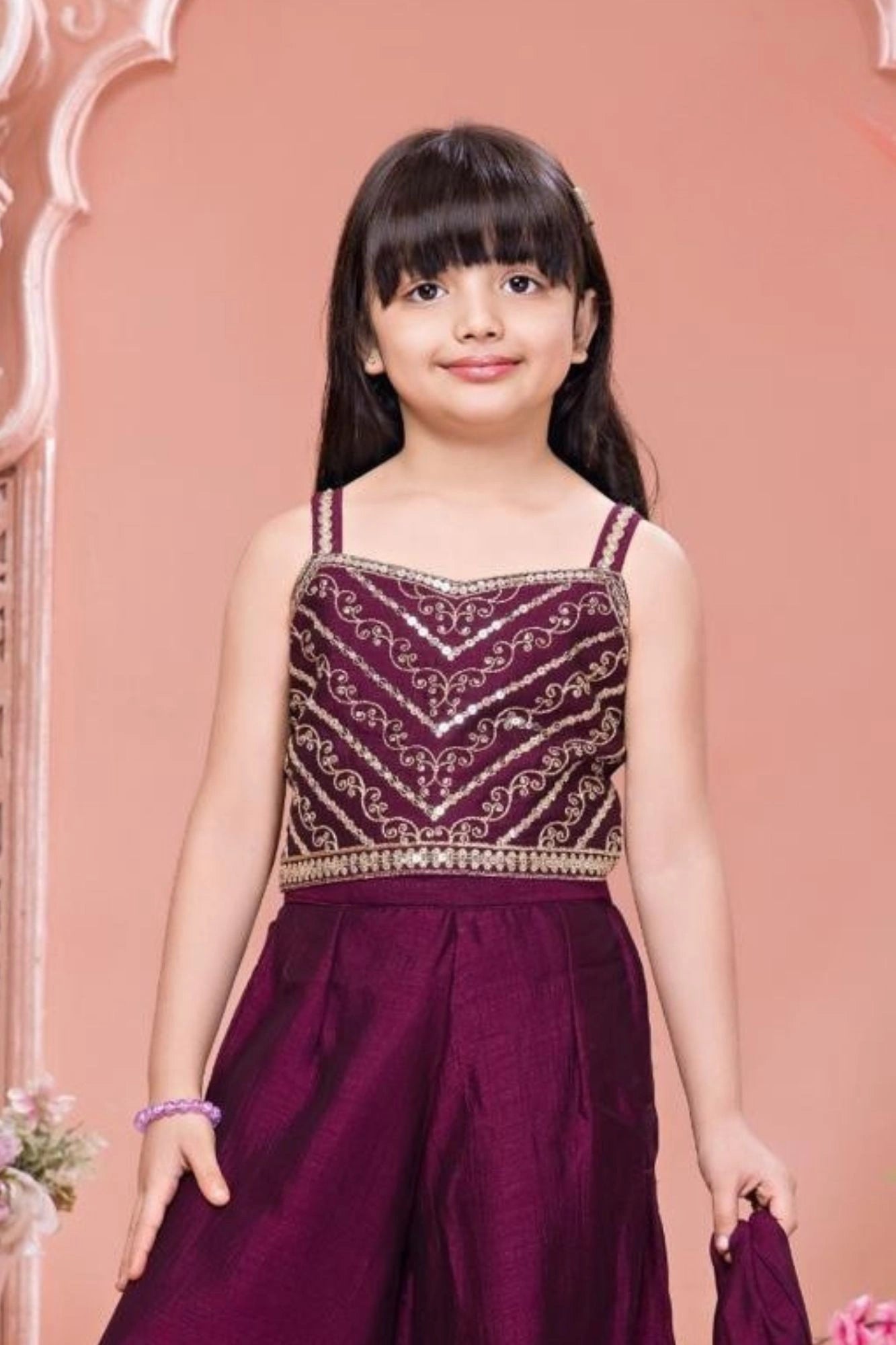 Wine Embroidered  Palazzo Set With Dupatta For Girls