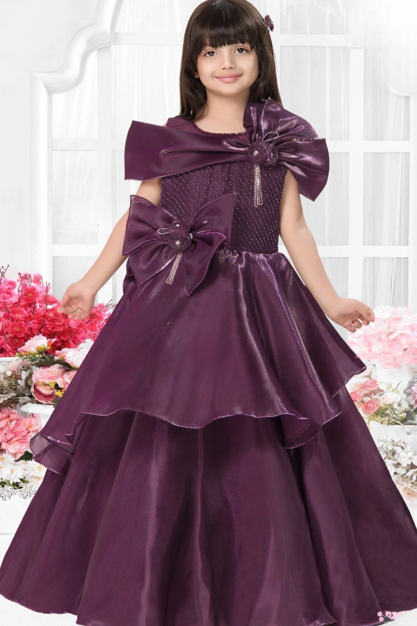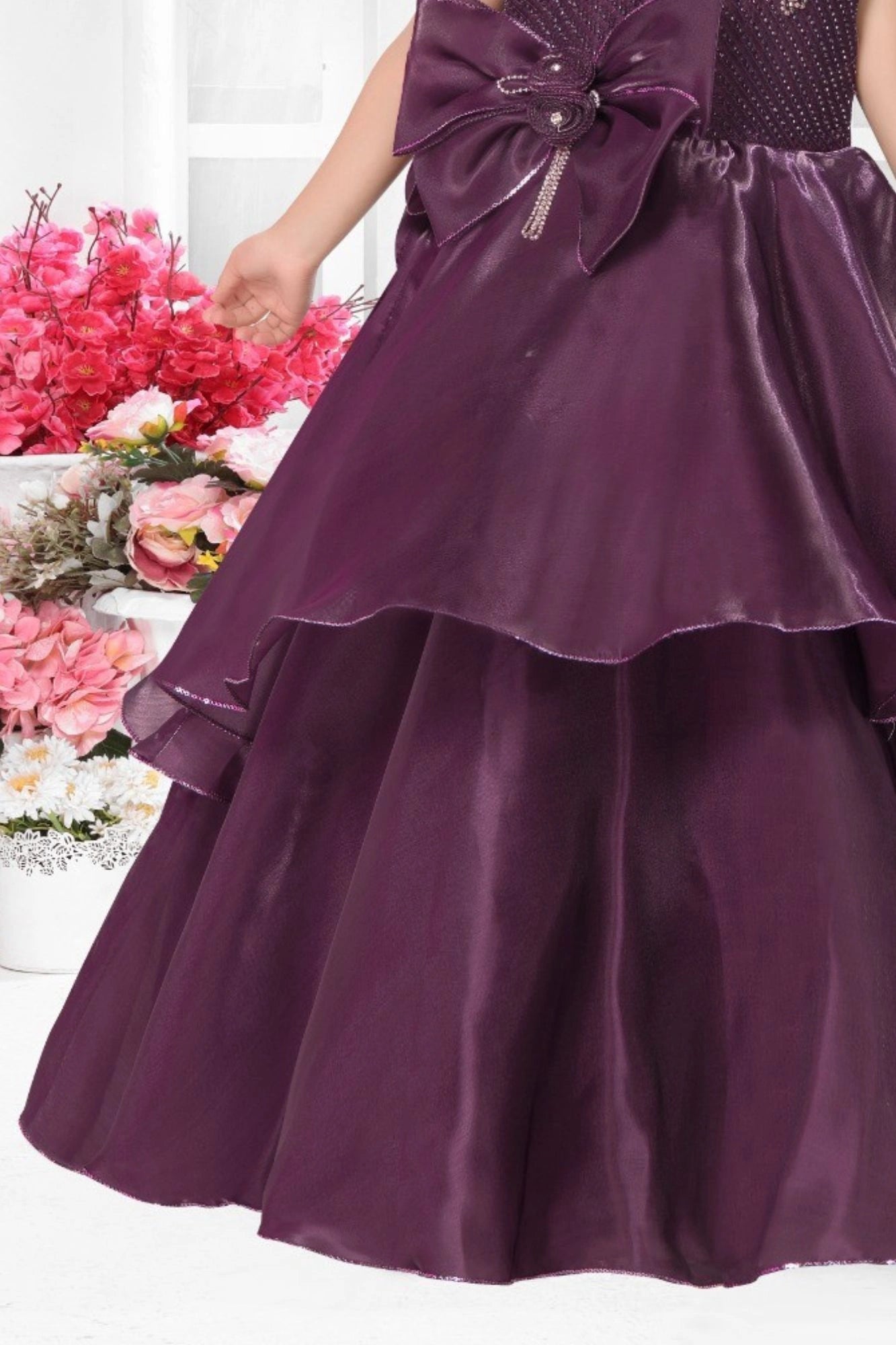 Dark Wine Embellished Off-Shoulder Party Gown For Girls