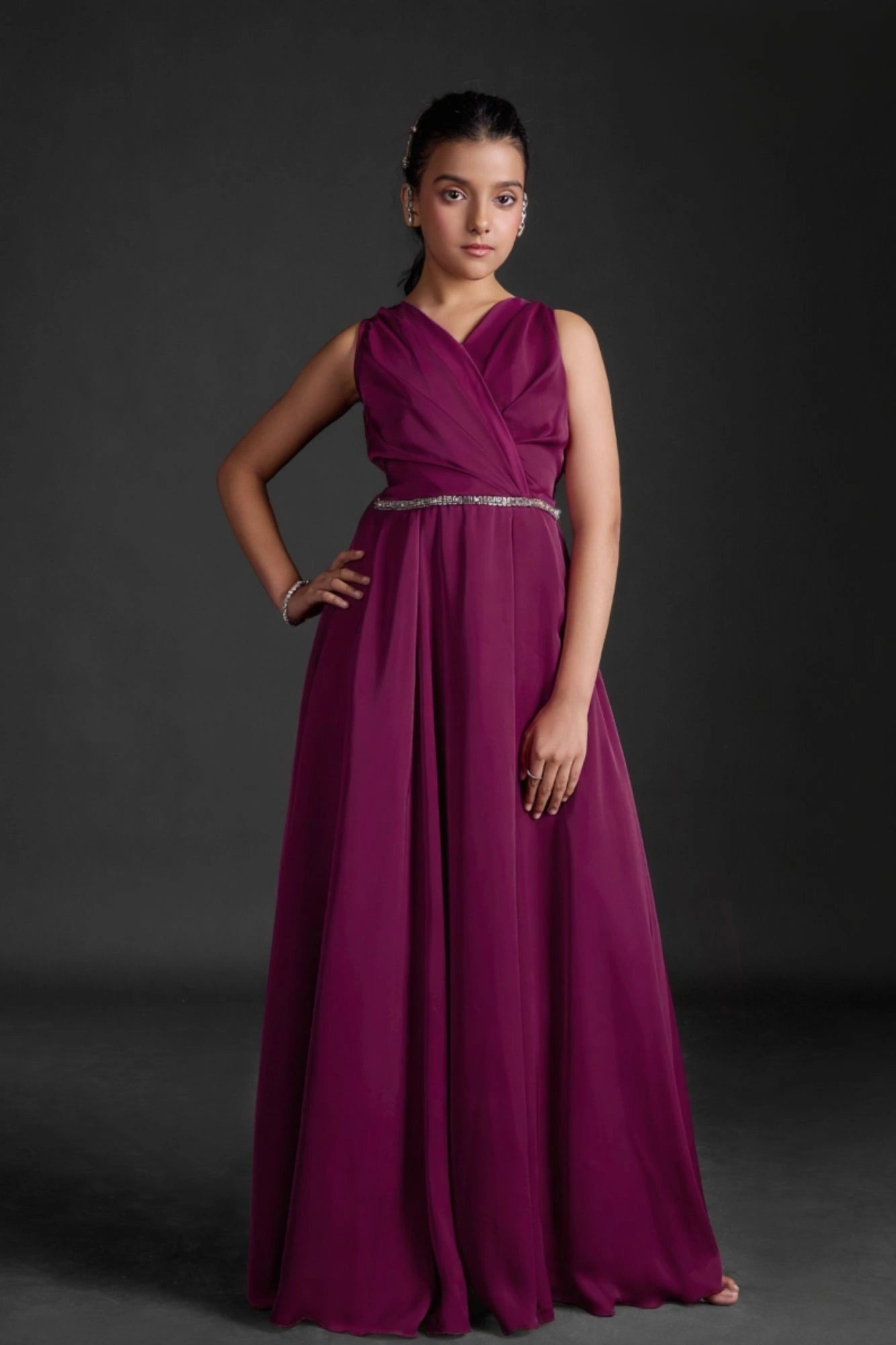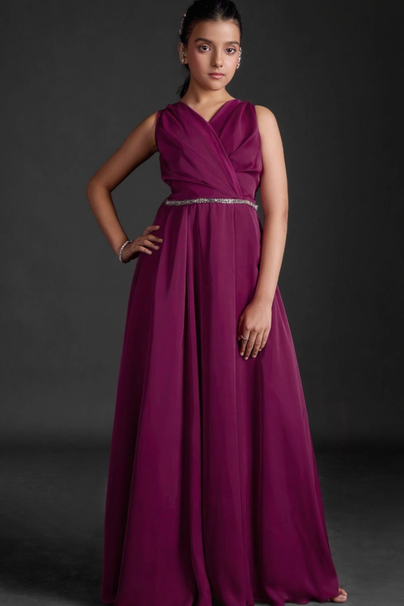 Wine Satin Evening Gown with Pleated Overlap Bodice For Girls
