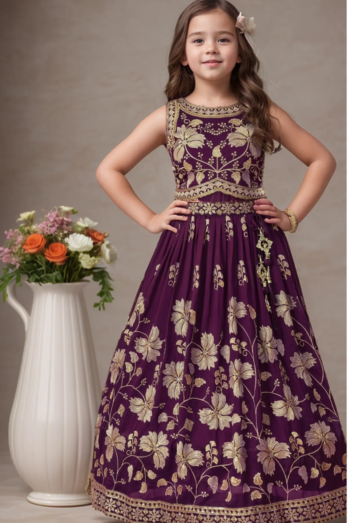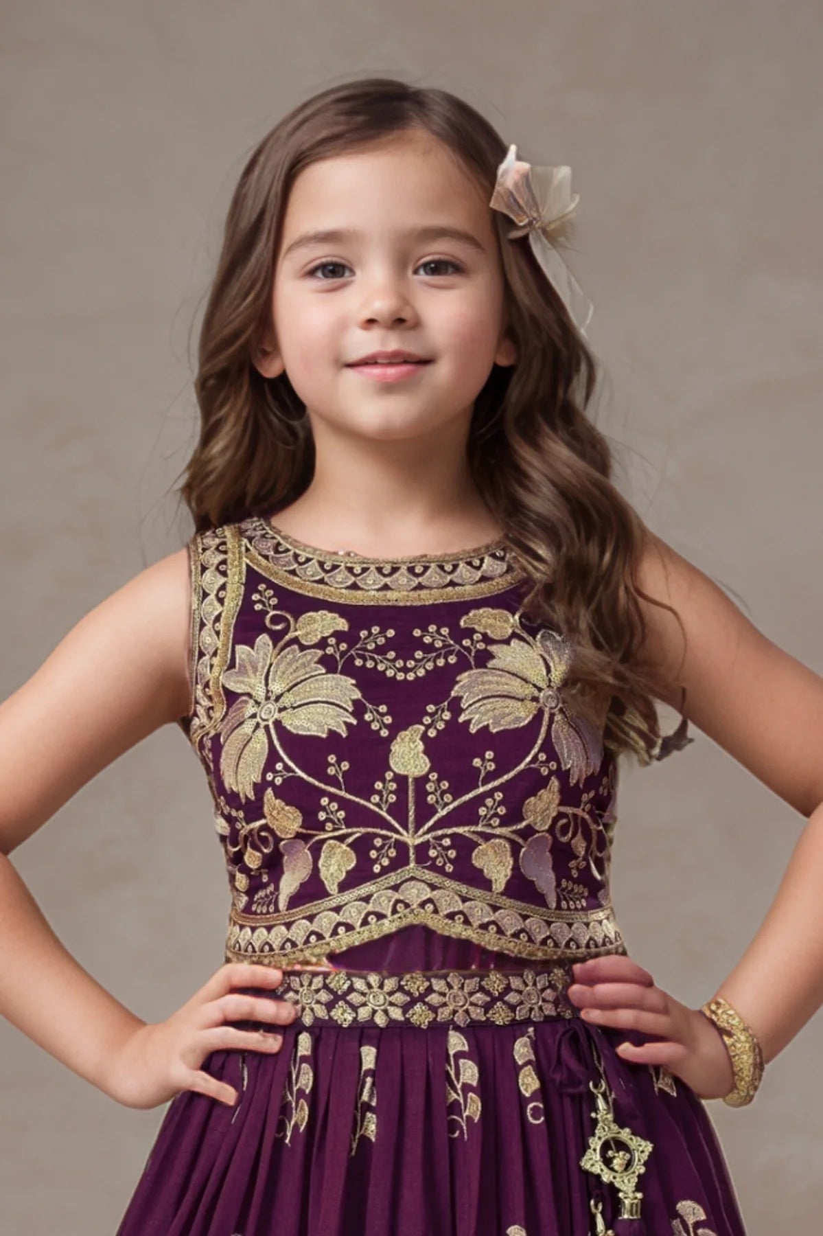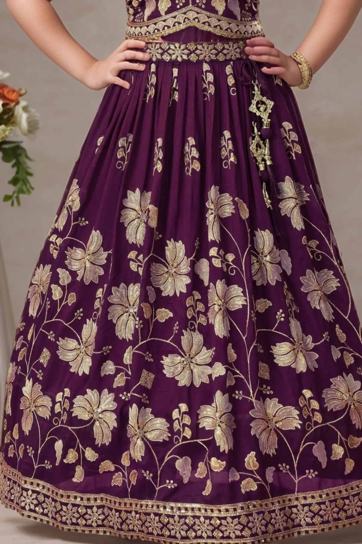 Wine Sequin Work And Zari Embroidery Lehenga Choli Set For Girls
