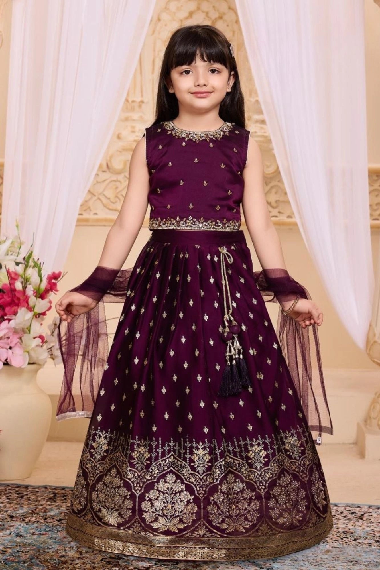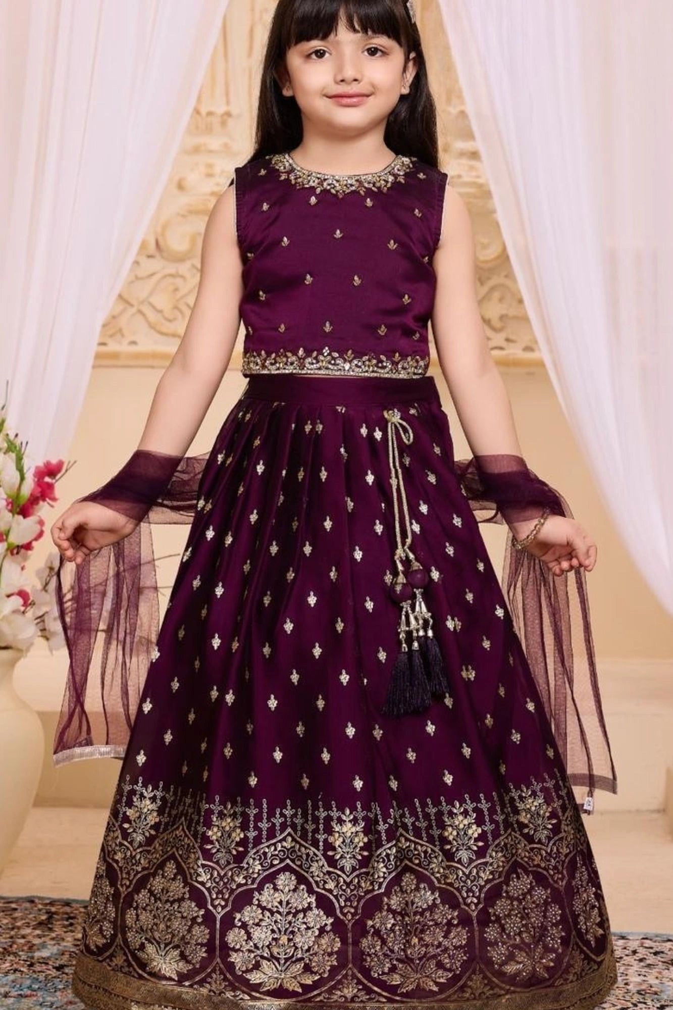 Wine With Gold Embroidered Lehenga Choli for Girls