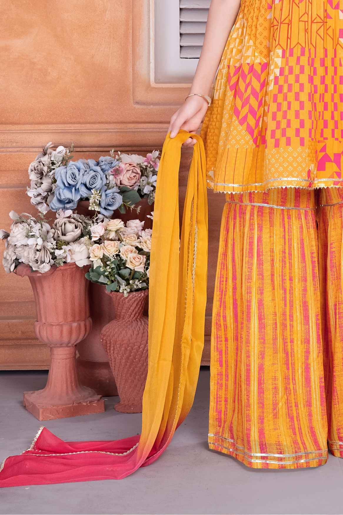Yellow Embroidered And Mirror Work Top With Sharara Bottom Set For Girls