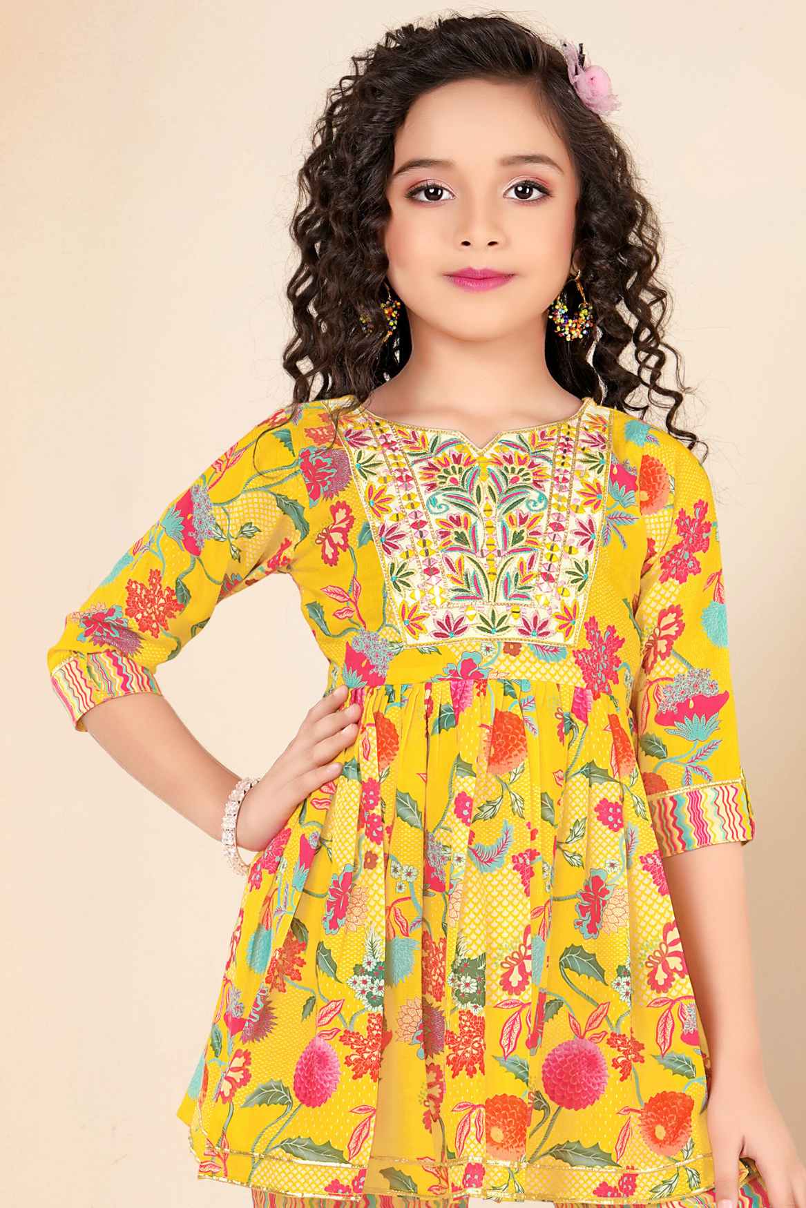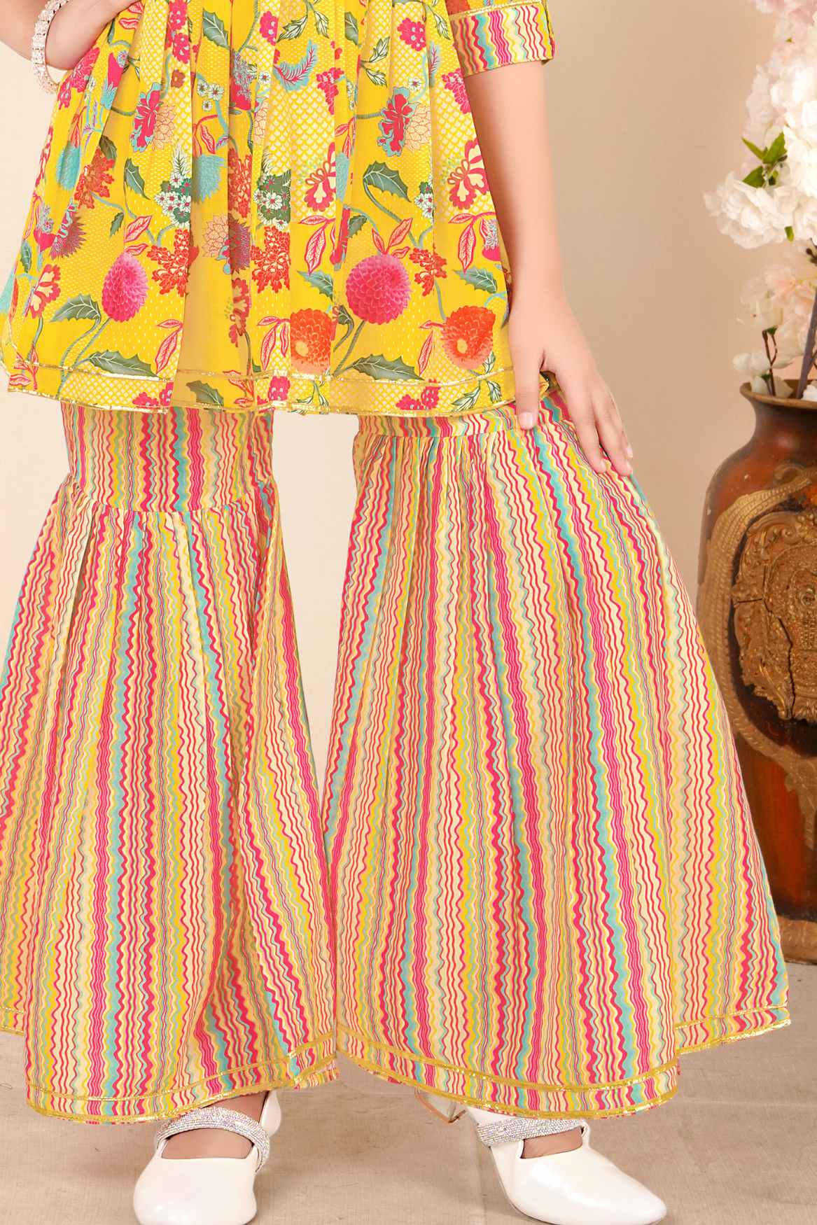 Yellow Embroidered Top With Sharara Bottom Set For Girls