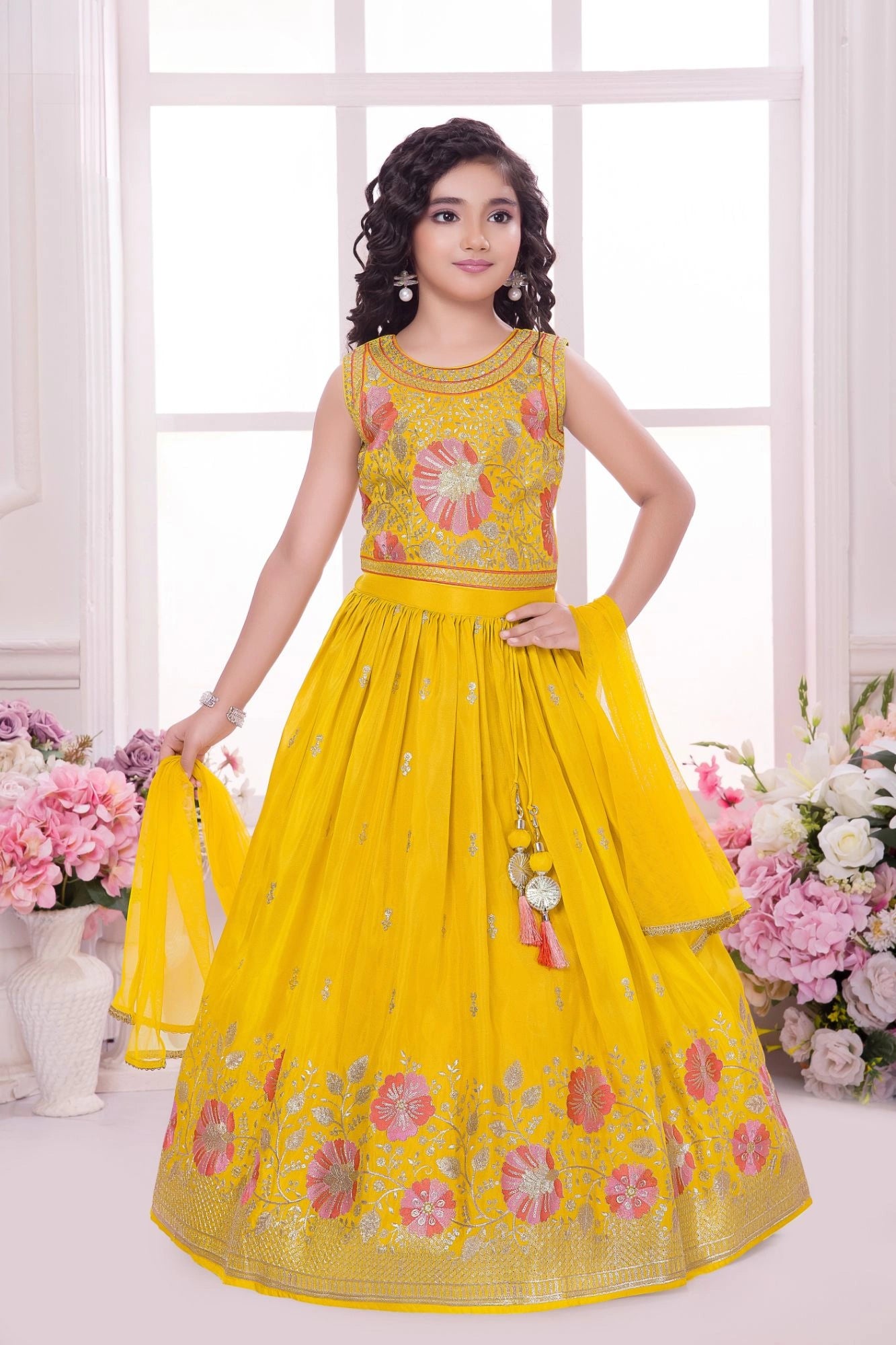 Yellow Floral Embroidered Lehenga Choli Set with Dupatta For Girls