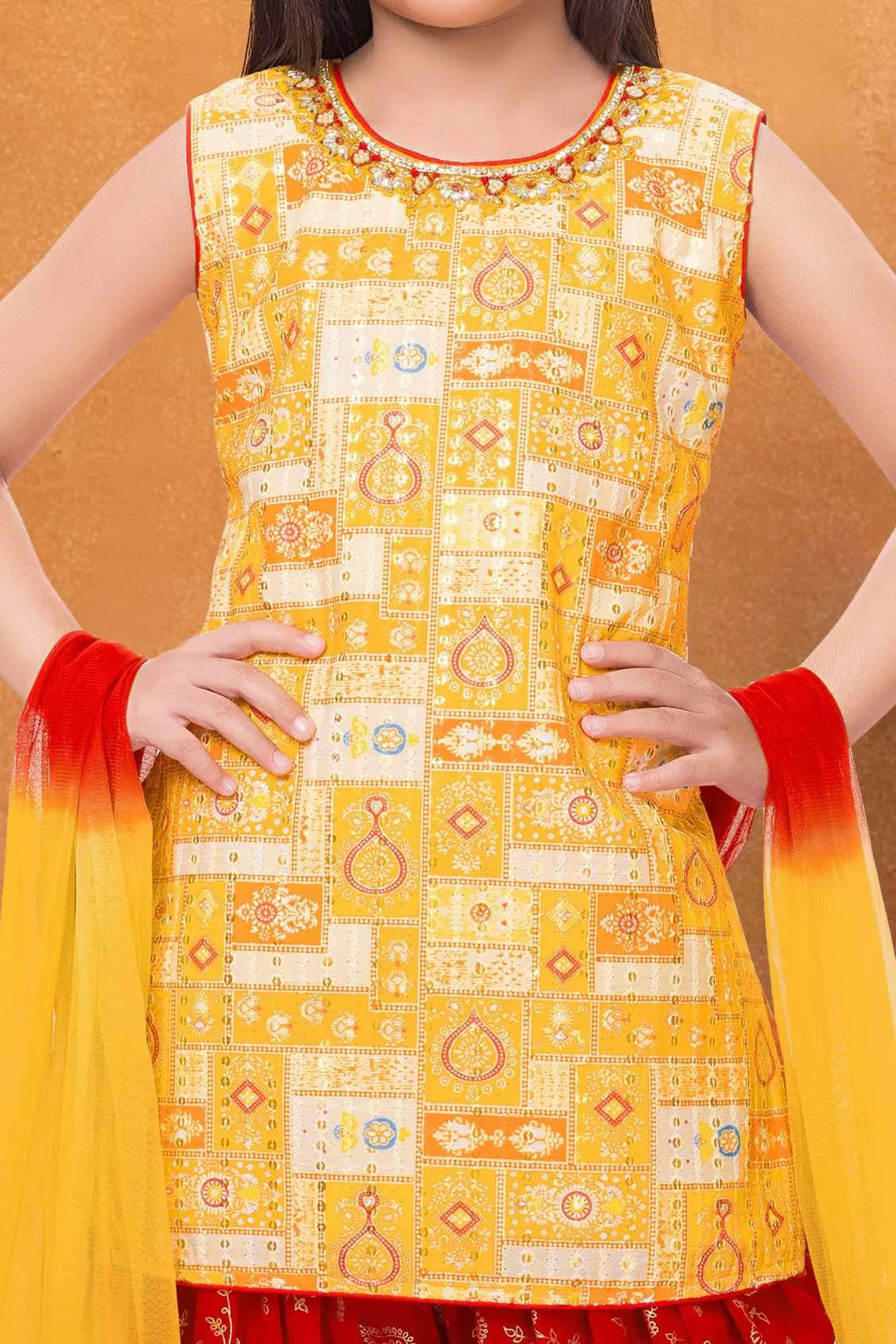 Yellow Kurti With Red Patiala Suit Set For Girls