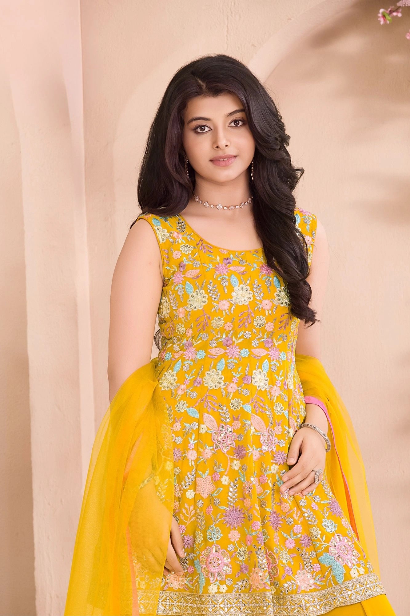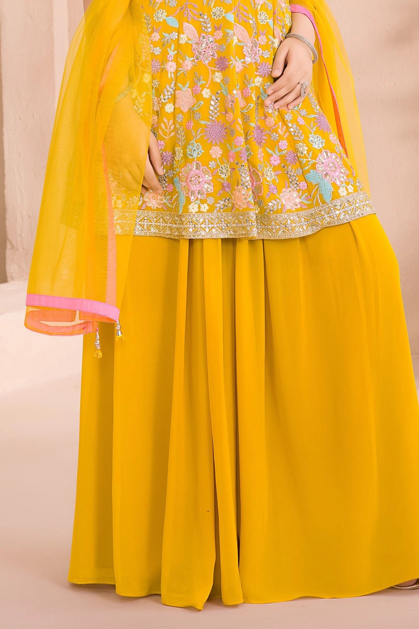 Yellow Palazzo Set with Multicolor Floral Embroidered Top And Dupatta for Girls
