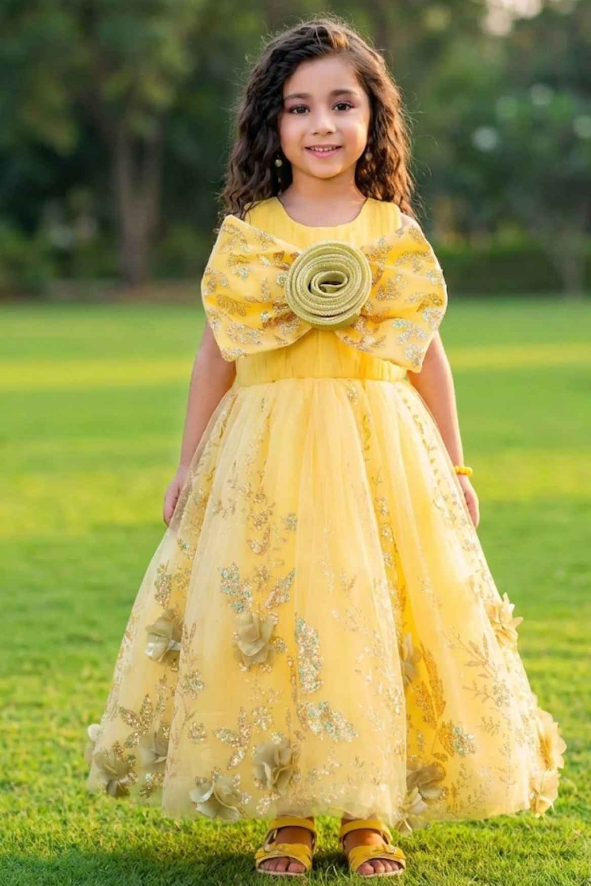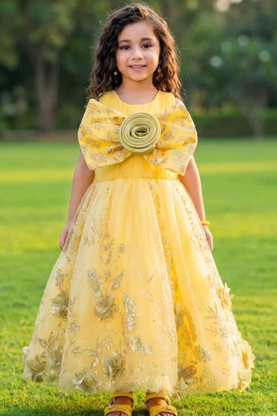 Yellow Sequin Party Gown with 3D Floral Bow For Girls